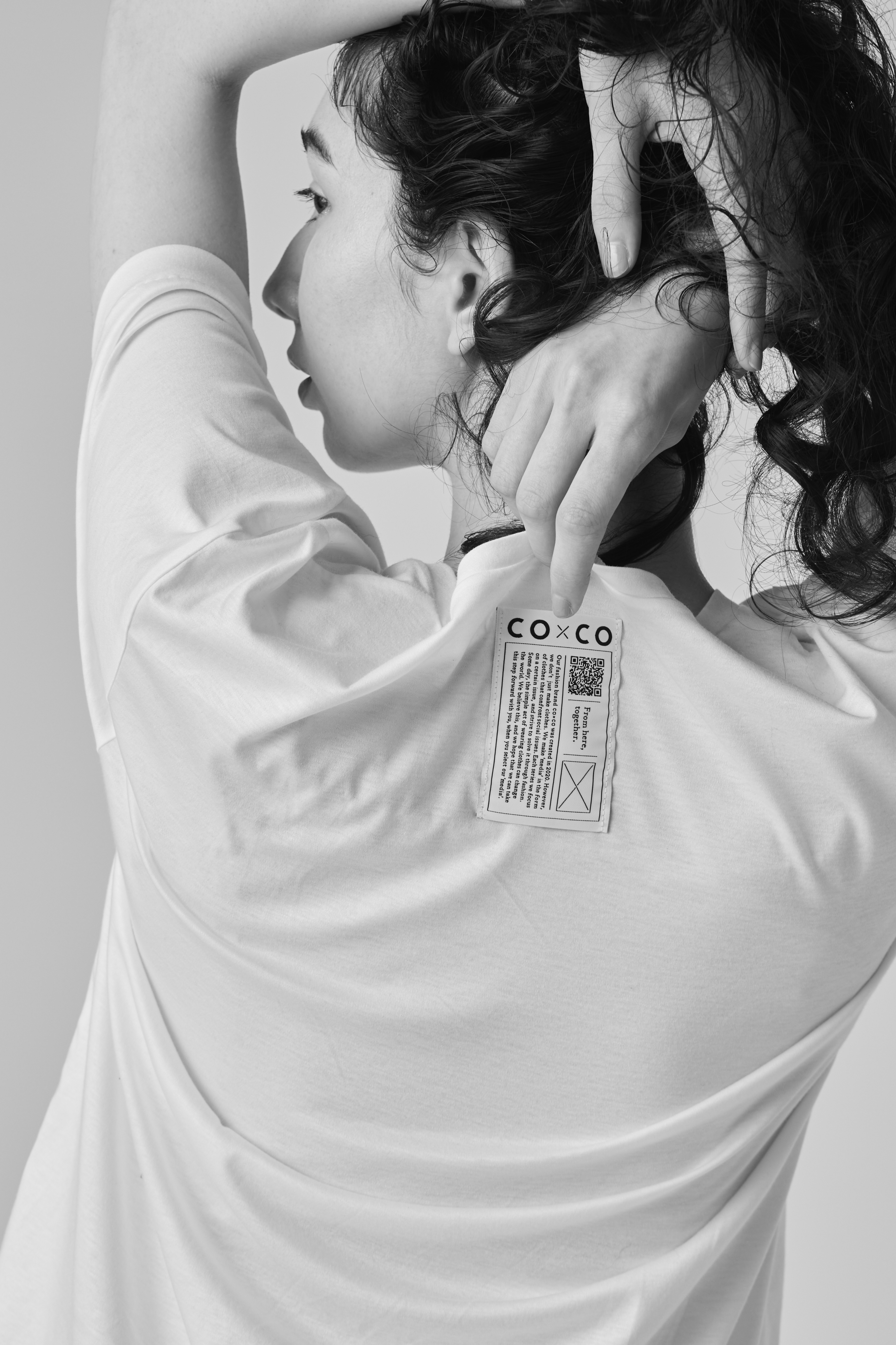 QRコードから、服の生産過程やストーリーがわかる、coxcoの定番ライン。