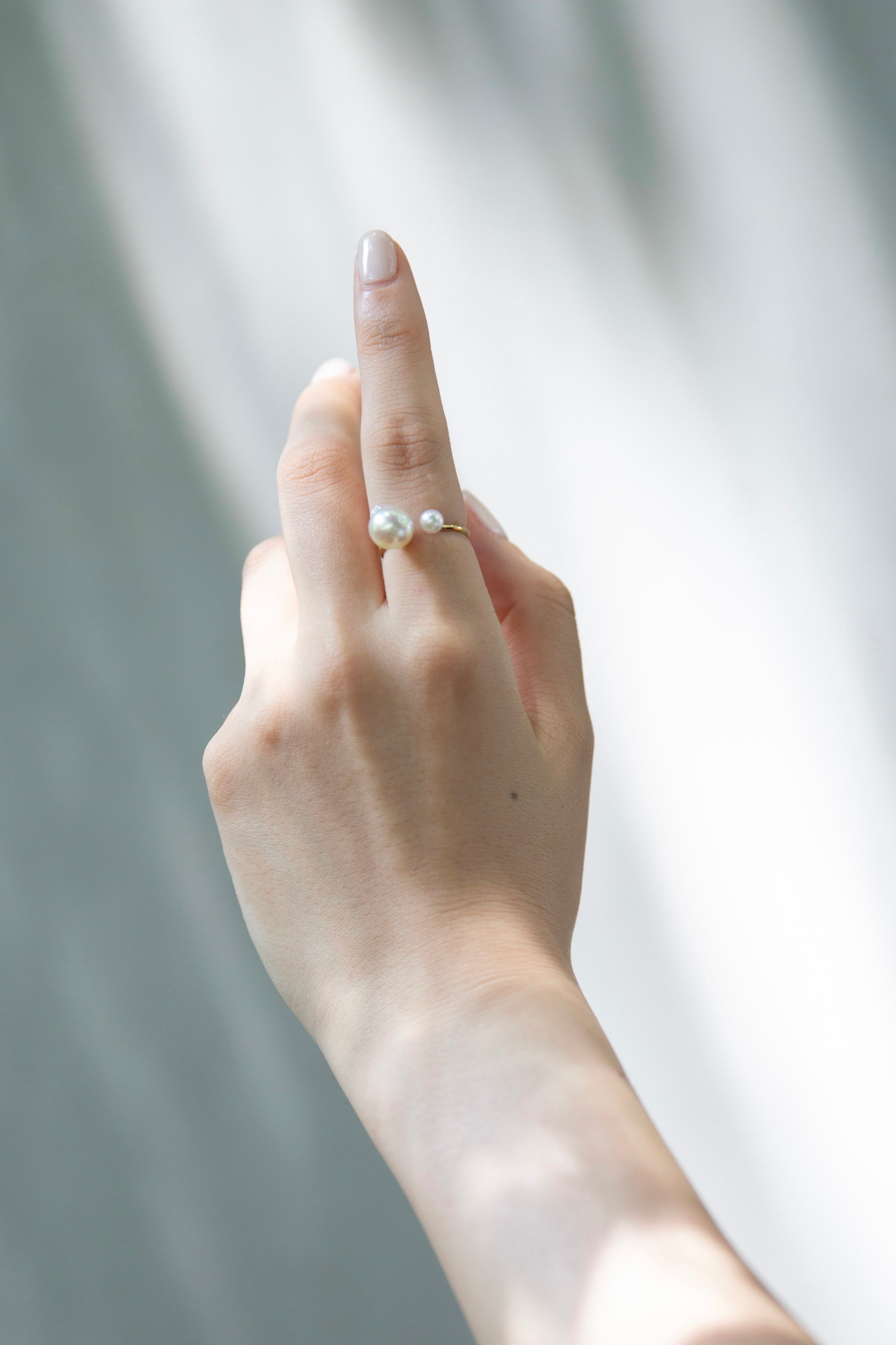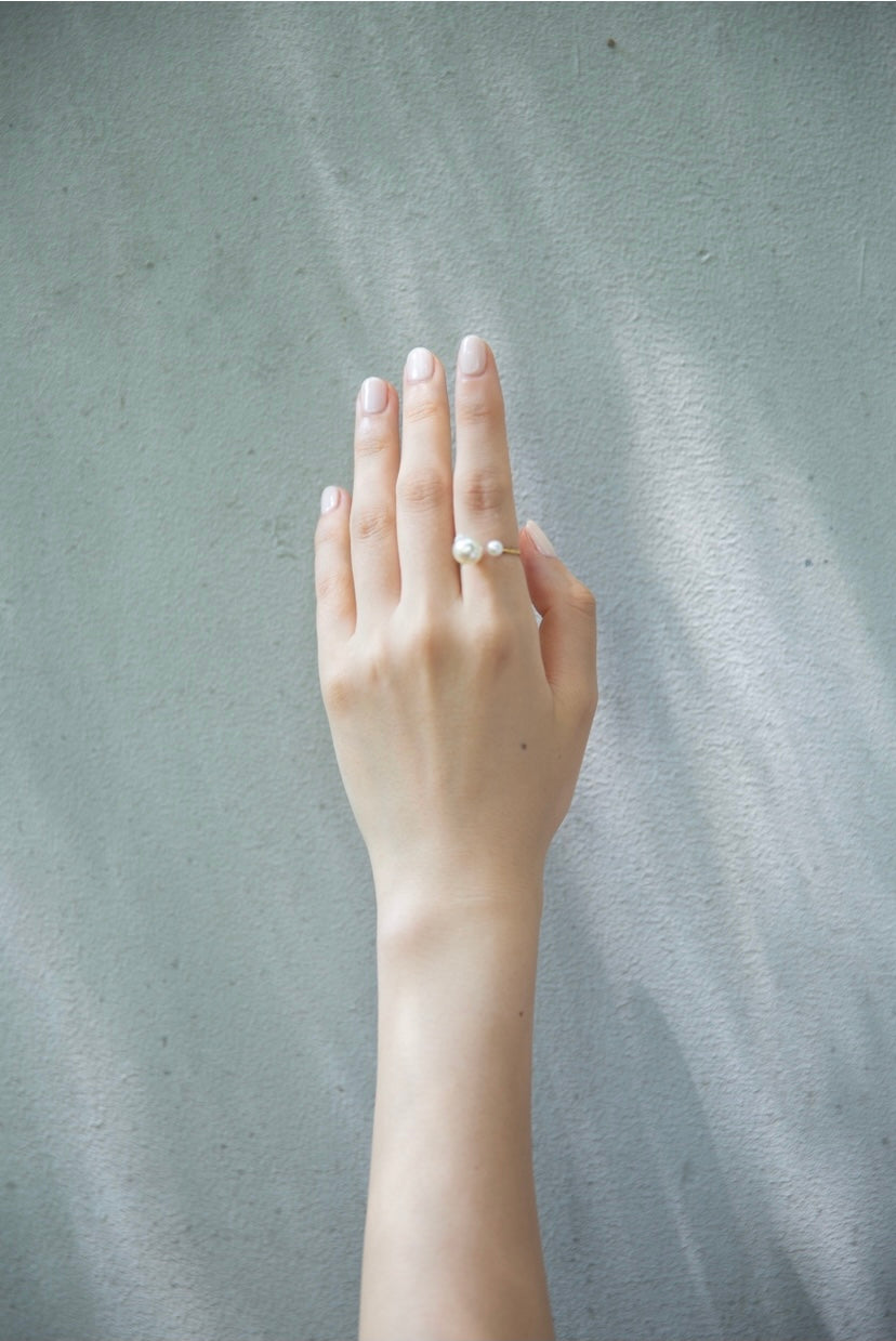 手元を華やかに見せてくれるジュエリー。真丸ではなく、少し変形をしたアコヤ真珠を使用しています。ゴールドのジュエリー部分は細身のデザインで、エレガントに、そして普段使いもしていただきやすいリングです。