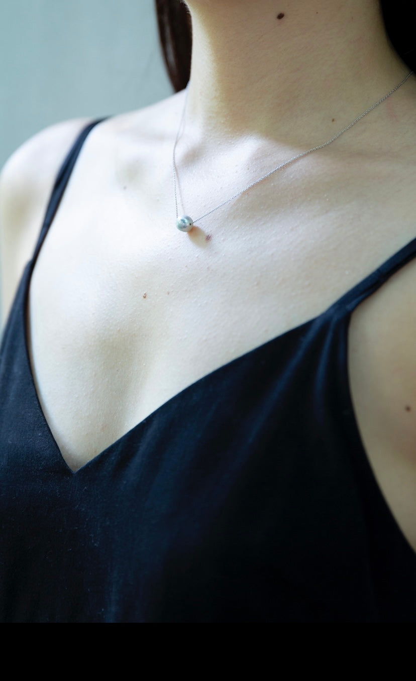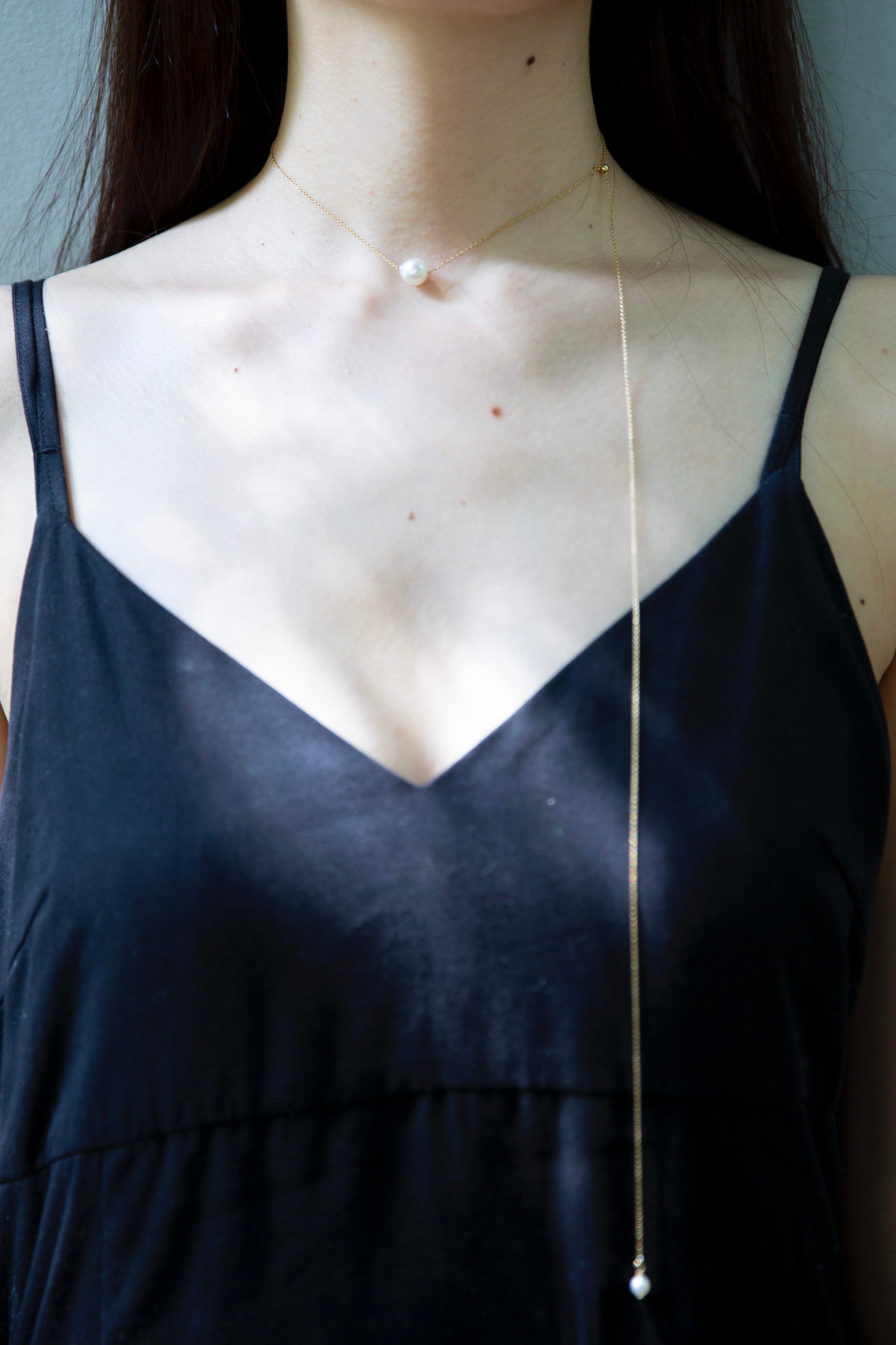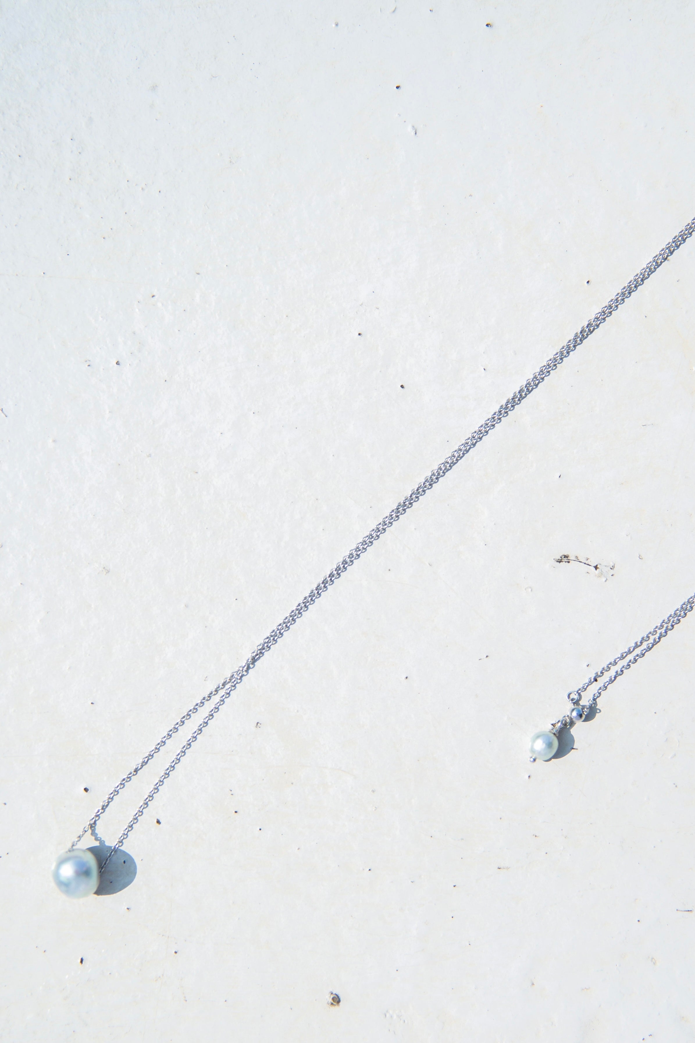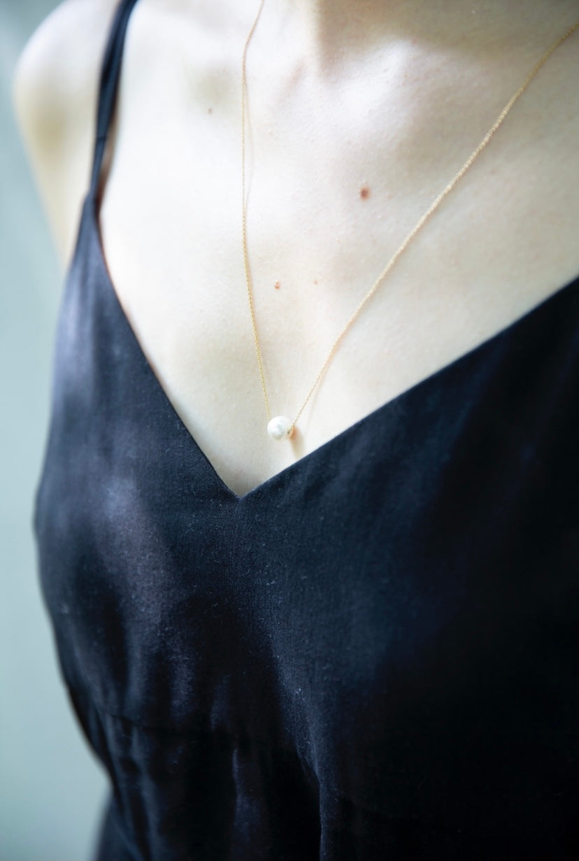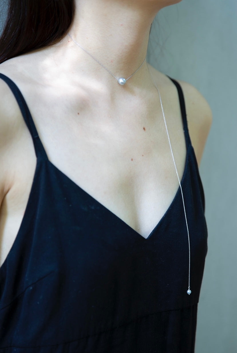 上品さを纏ったアコヤネックレス。"真丸ではなく、少し変形をしたアコヤ真珠を使用しています。シリコンボールで長さの調整可能で、チェーンを長くエレガントにも、チョーカー風に遊びごごろのあるスタイルもお楽しみいただけます。