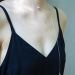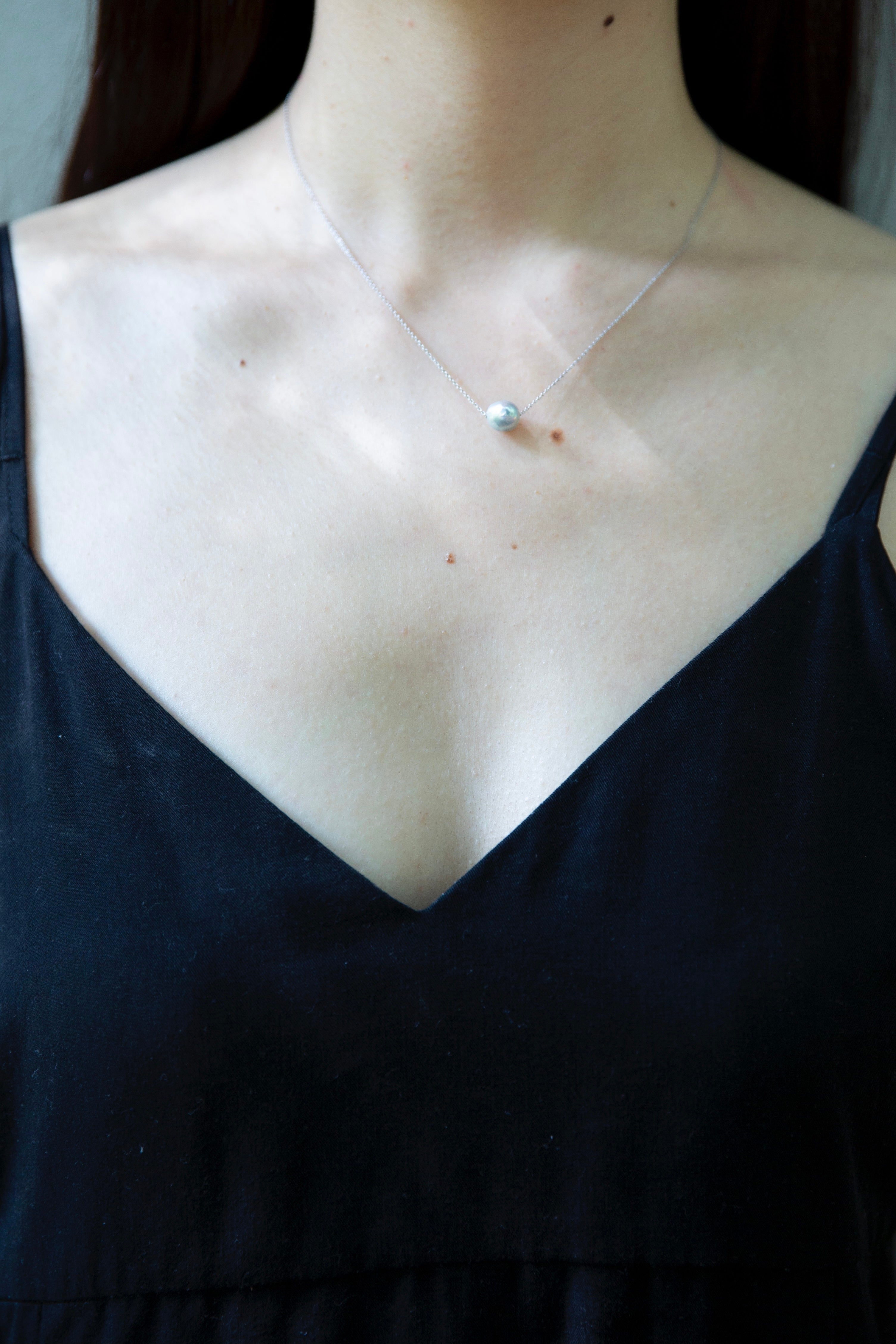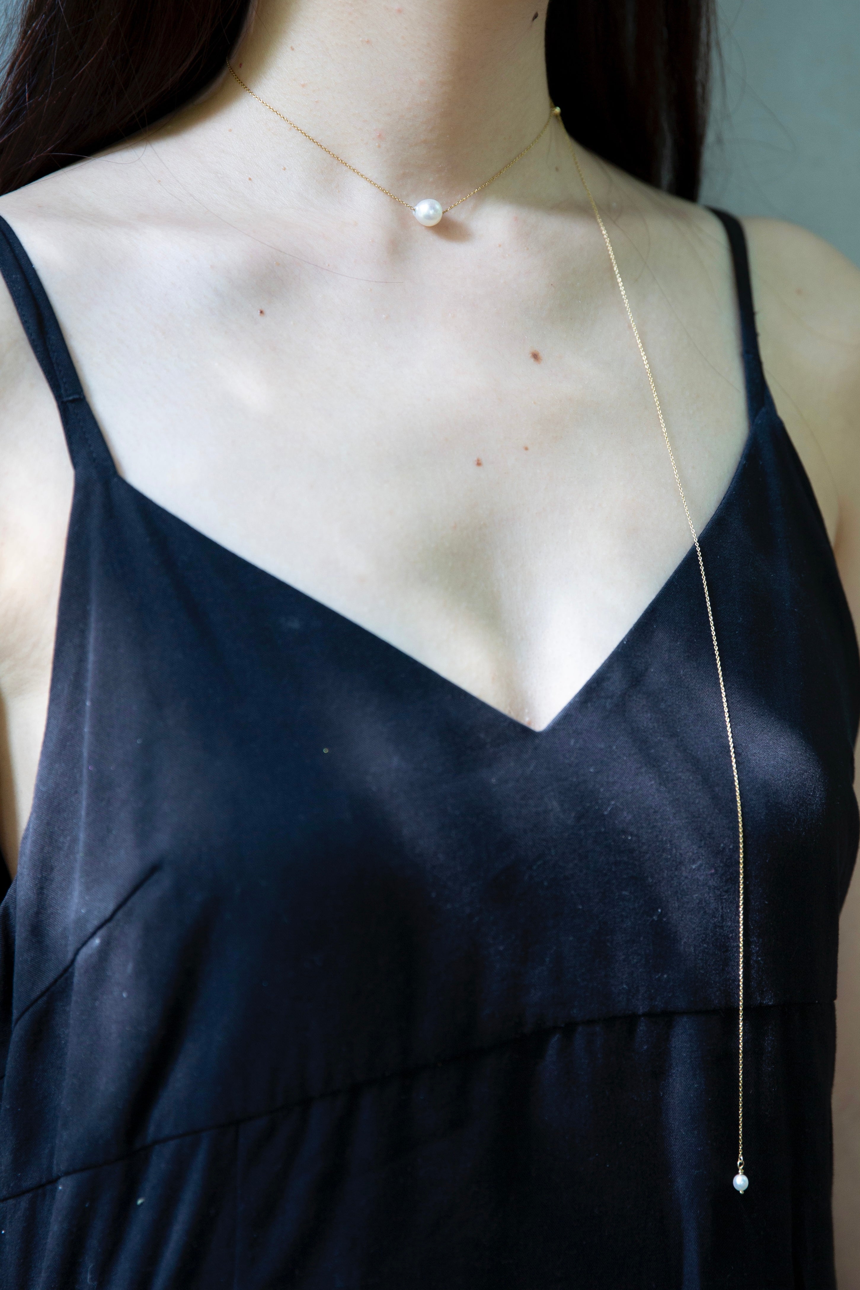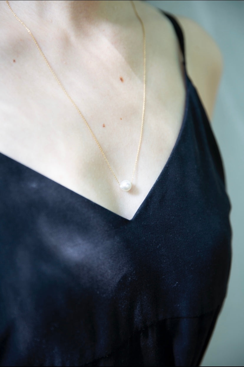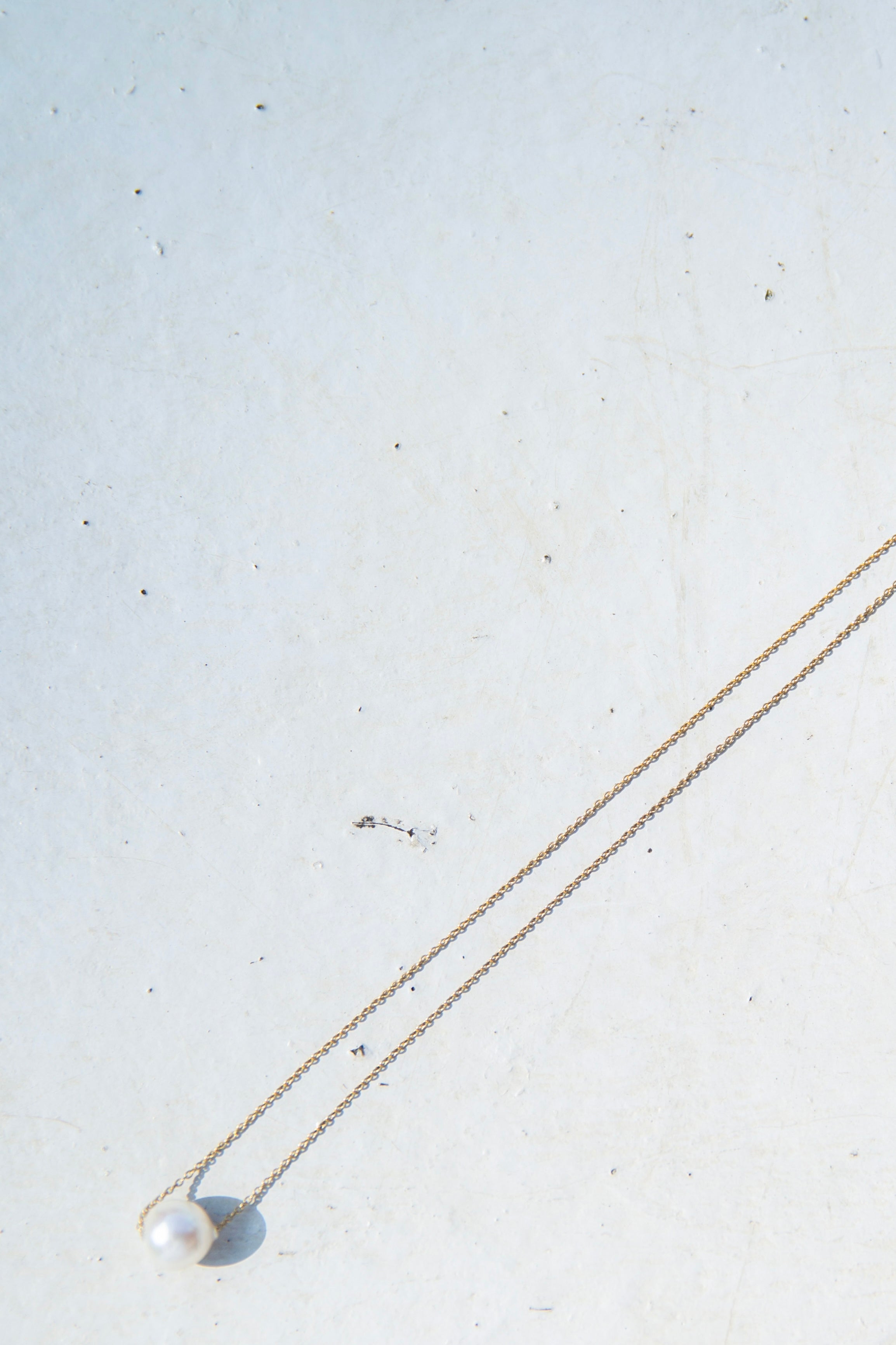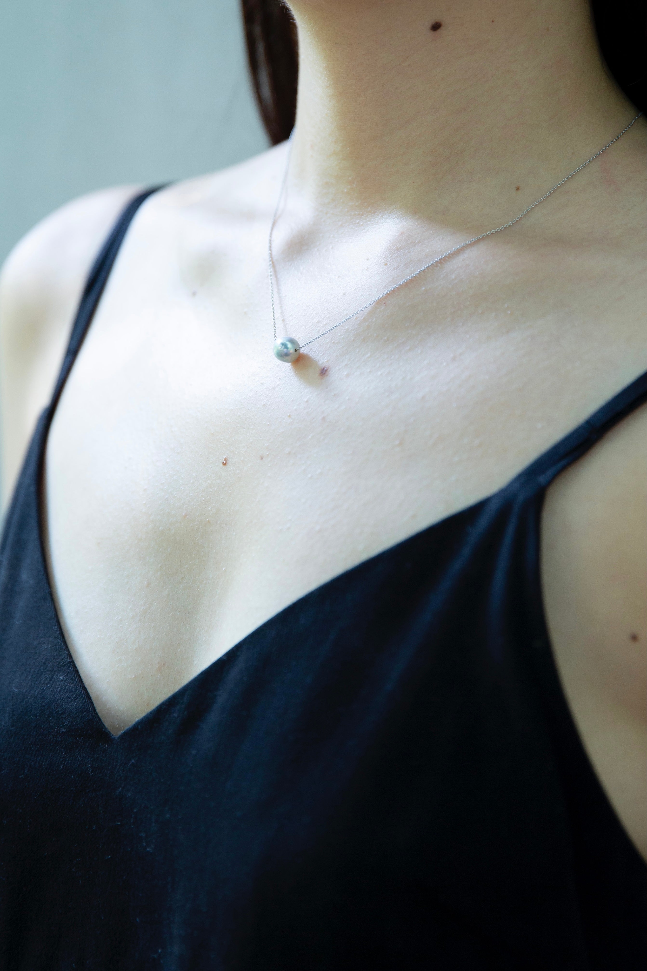 上品さを纏ったアコヤネックレス。"真丸ではなく、少し変形をしたアコヤ真珠を使用しています。シリコンボールで長さの調整可能で、チェーンを長くエレガントにも、チョーカー風に遊びごごろのあるスタイルもお楽しみいただけます。