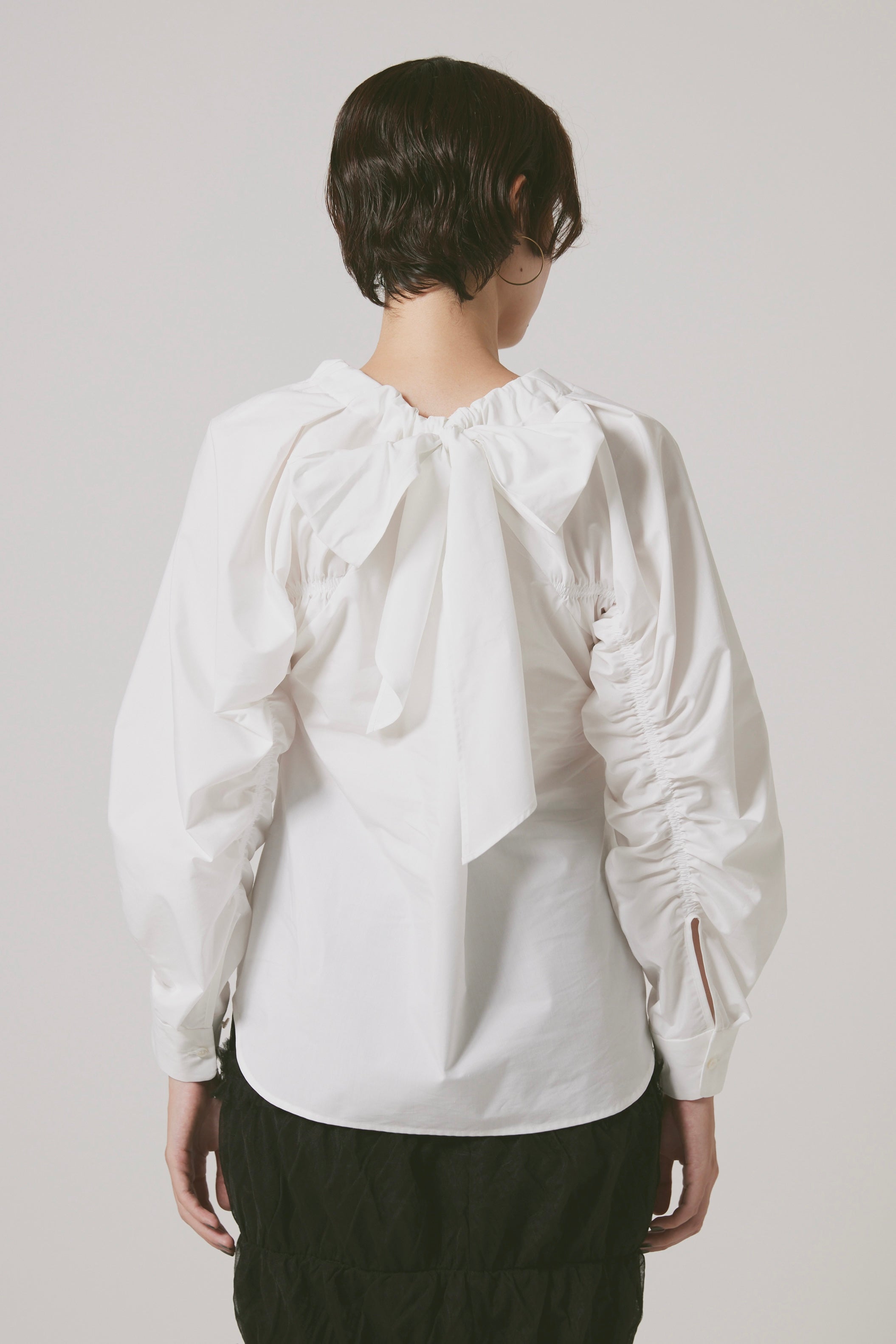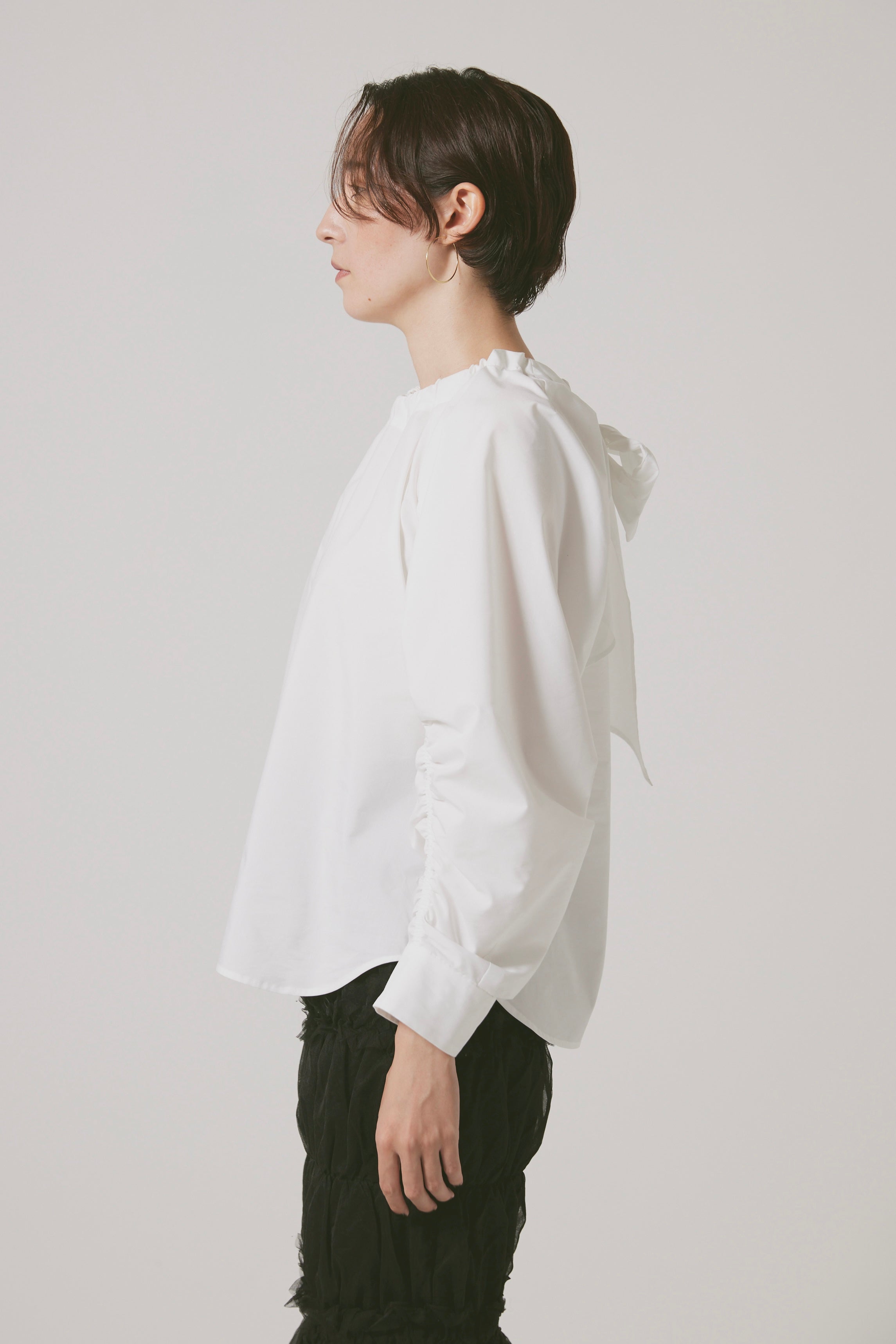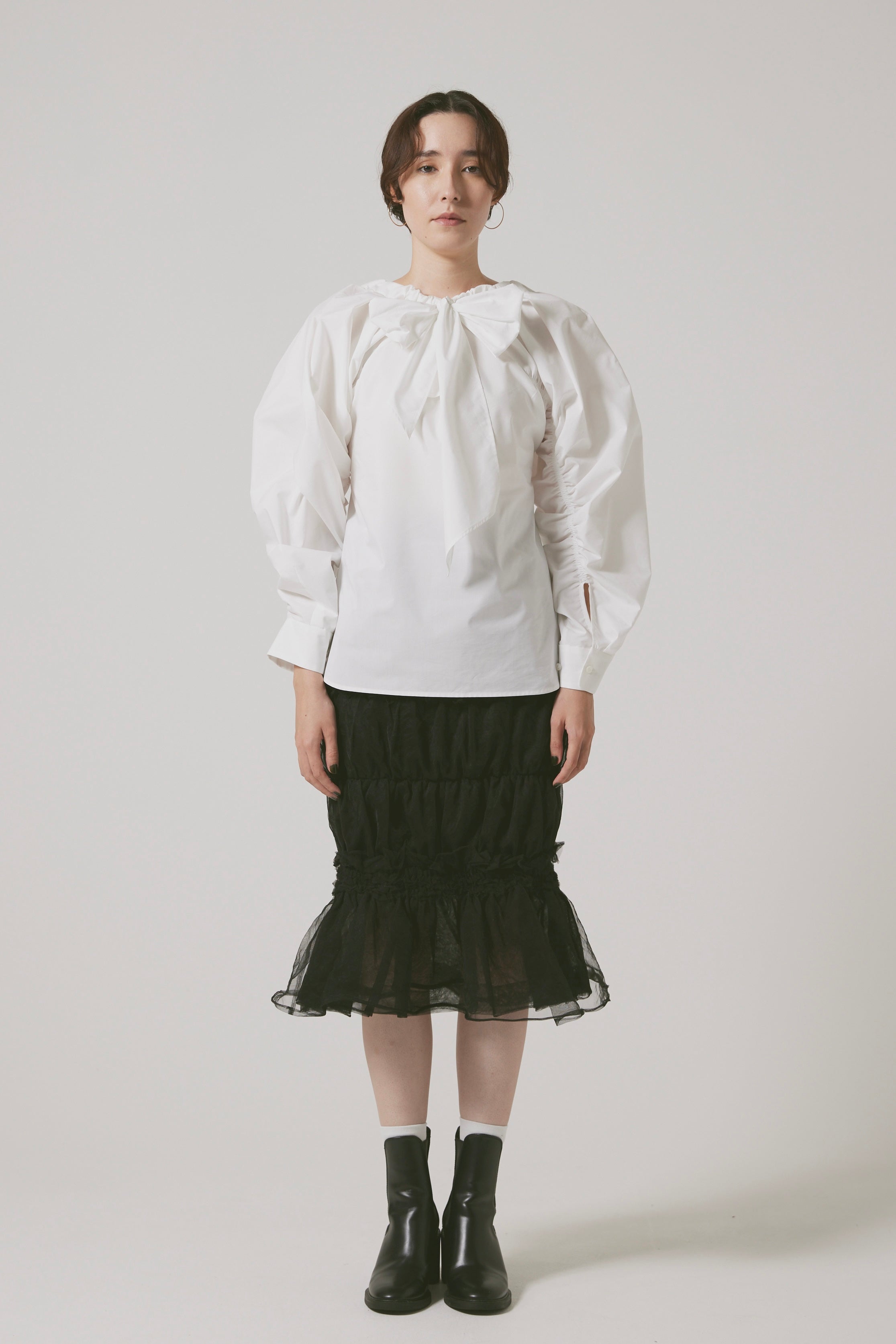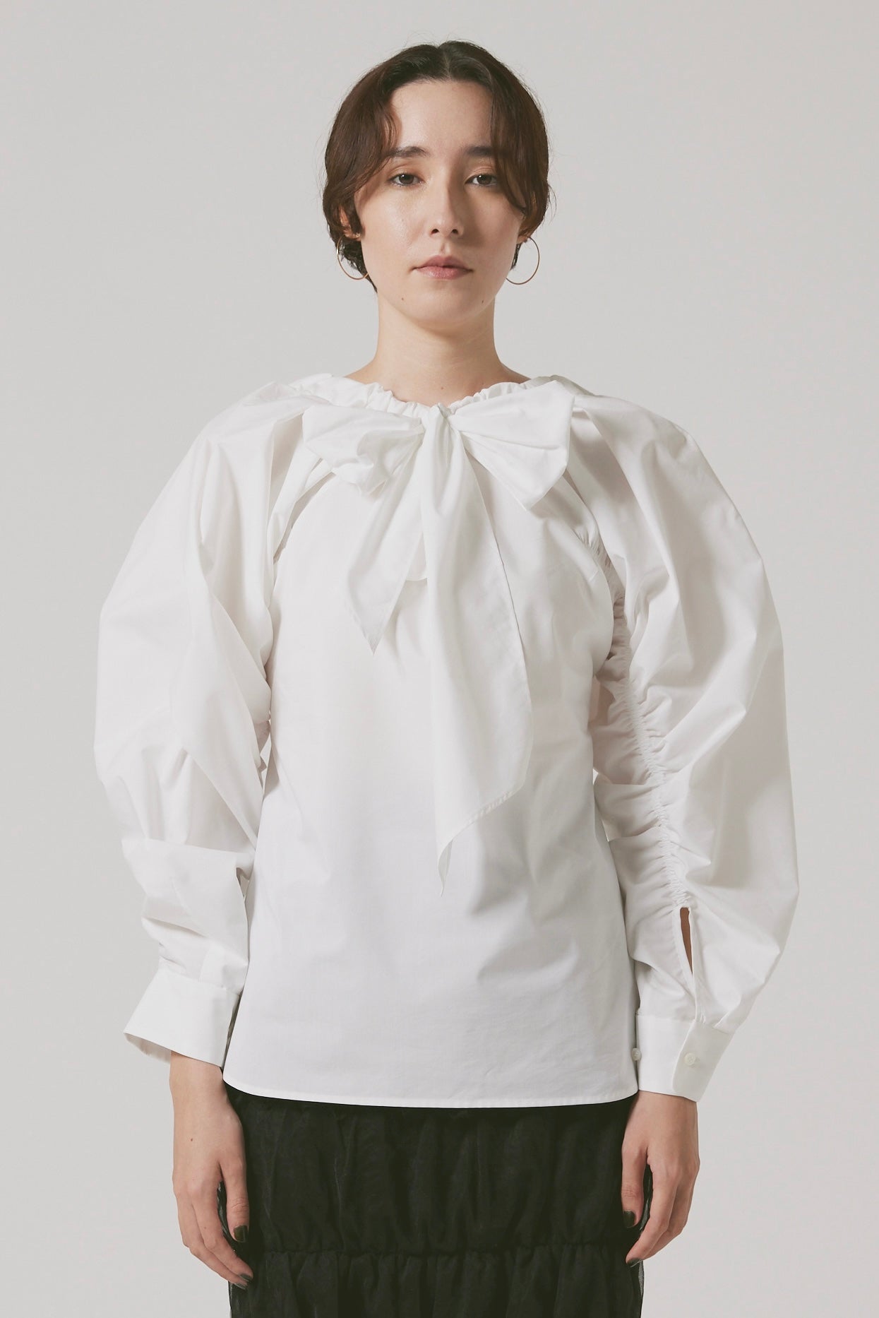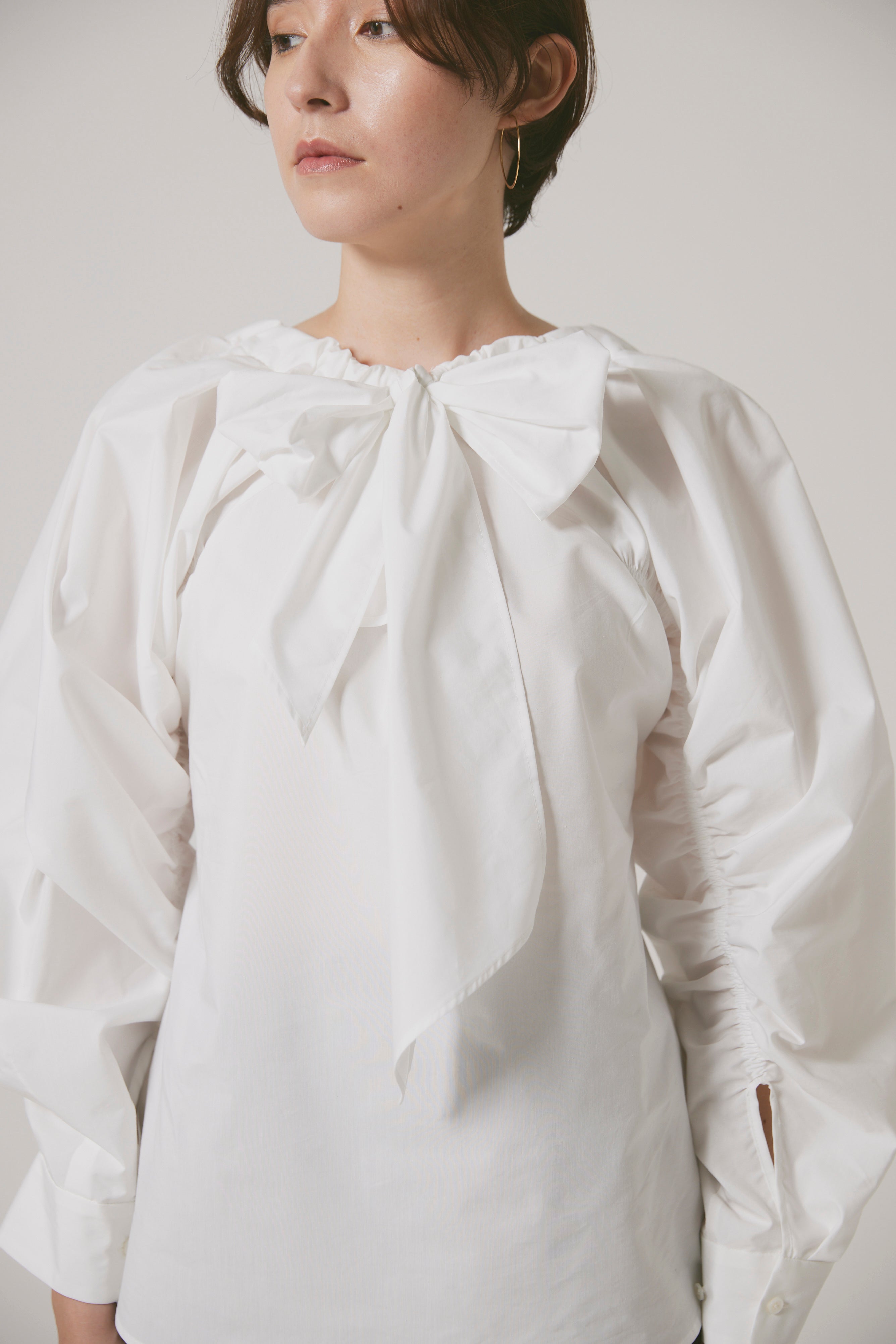 素材はたくさんのブラウス生地の中から、悩み抜いて選んだオーコットとリサイクルペットボトル由来ポリエステルのミックス生地。適度なハリと密度があり、リボンや袖のシルエットを立体的に際立たせています。端正な印象ながらシワになりづらく、お家でお洗濯できるというメリットもあります。