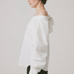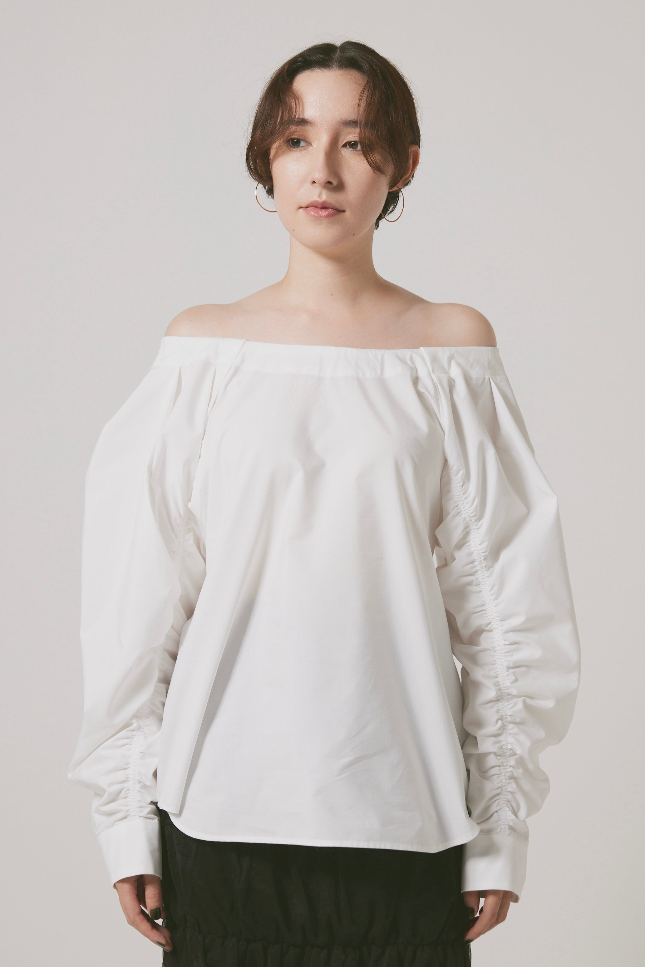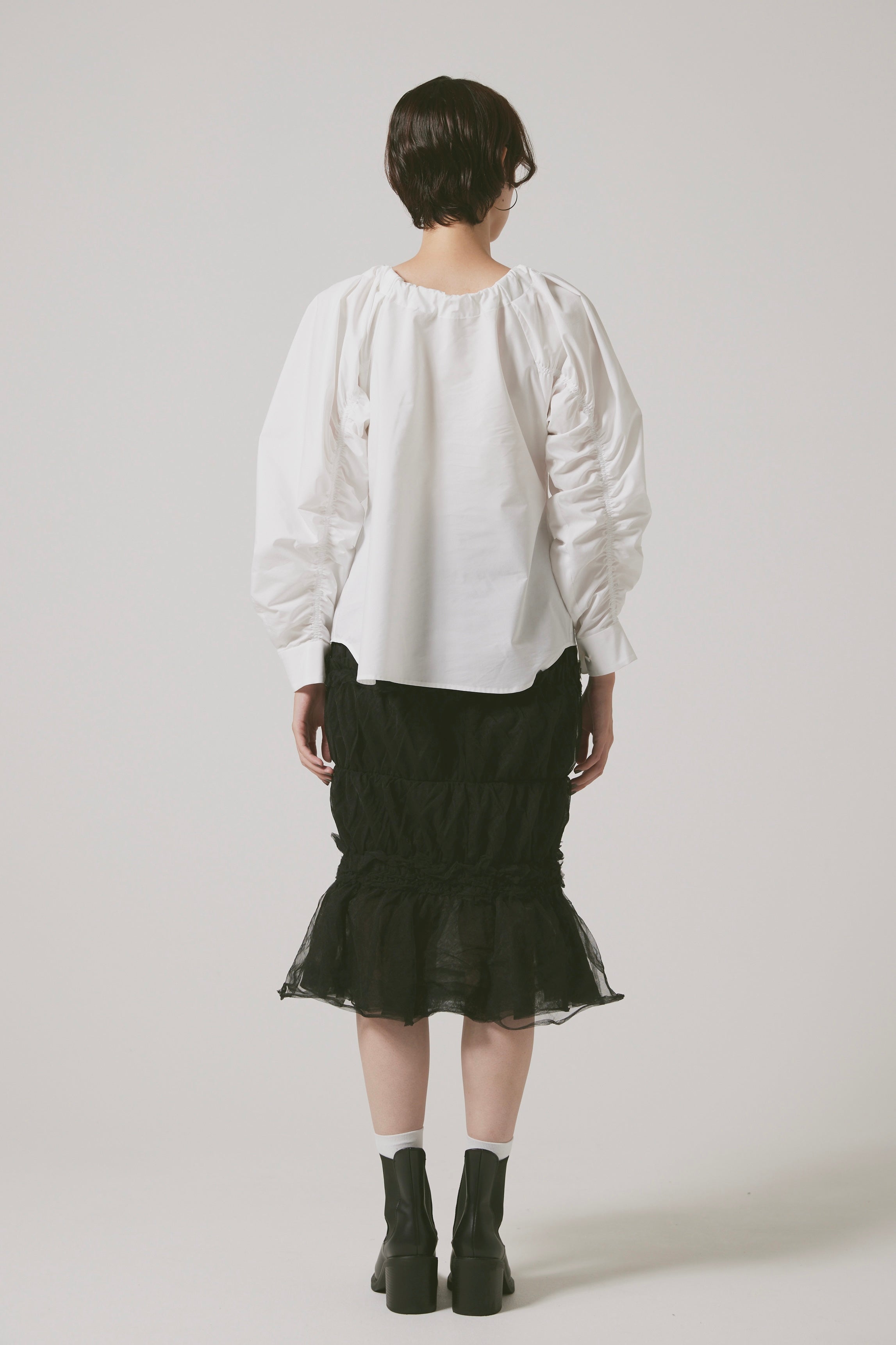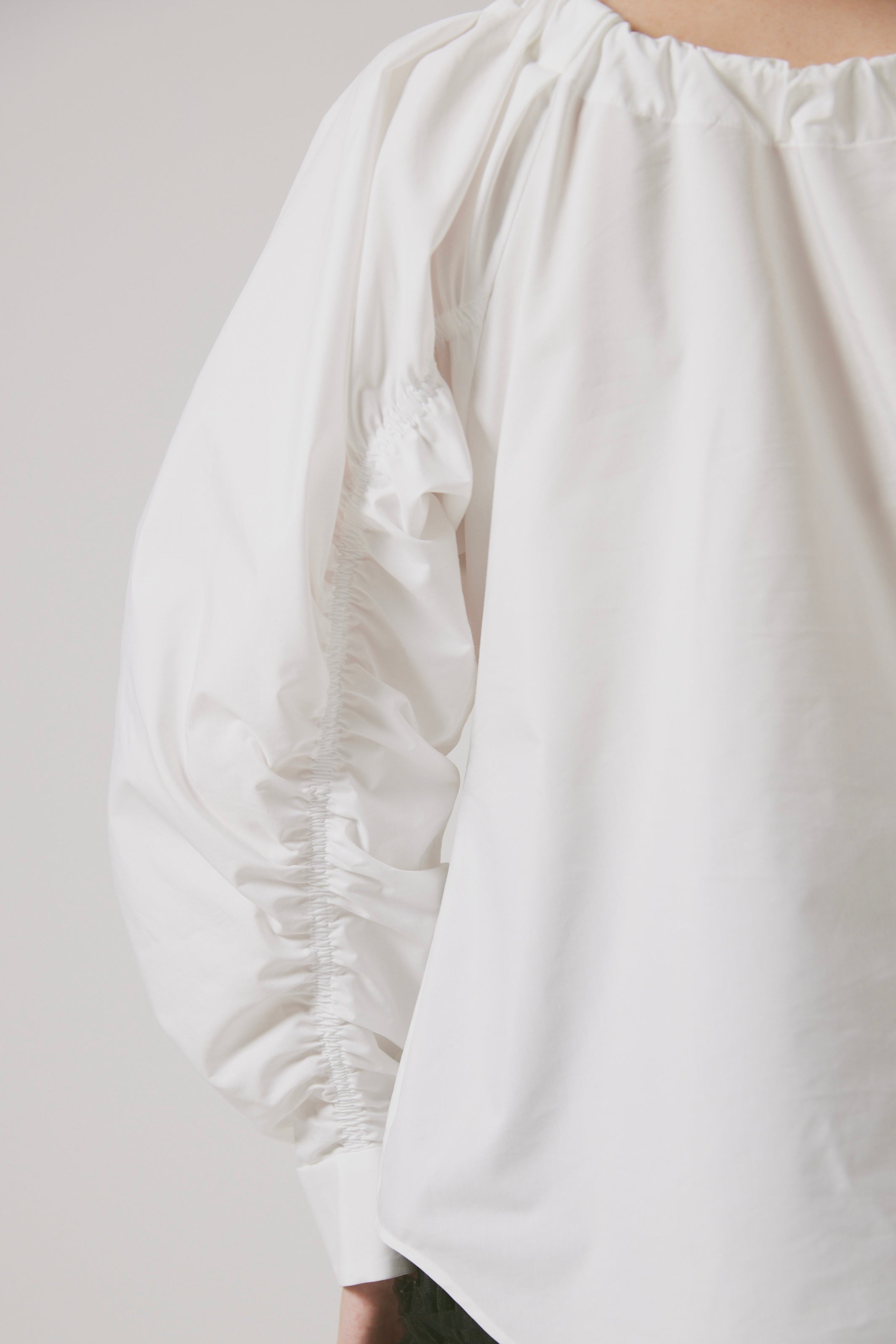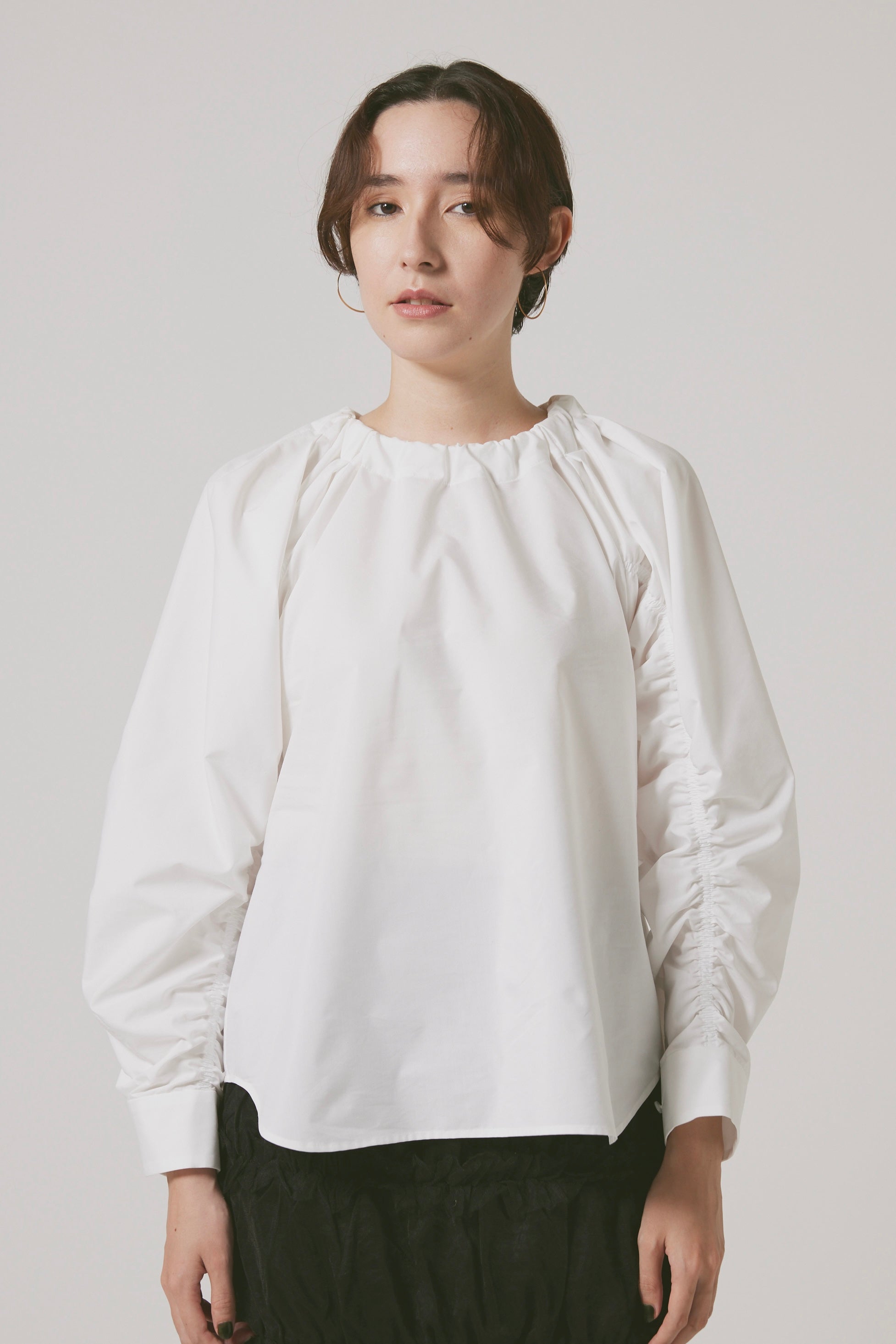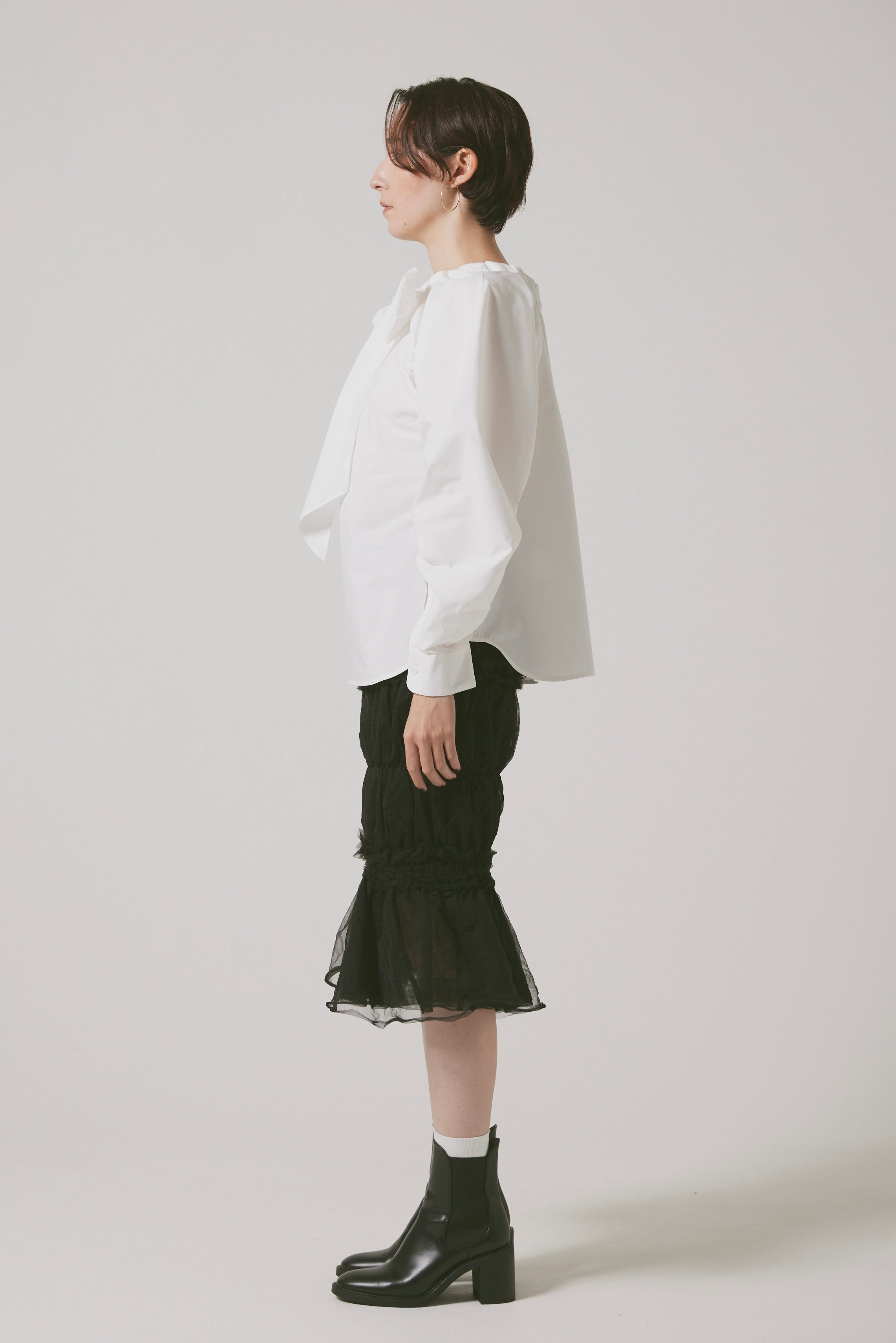 素材はたくさんのブラウス生地の中から、悩み抜いて選んだオーコットとリサイクルペットボトル由来ポリエステルのミックス生地。適度なハリと密度があり、リボンや袖のシルエットを立体的に際立たせています。端正な印象ながらシワになりづらく、お家でお洗濯できるというメリットもあります。