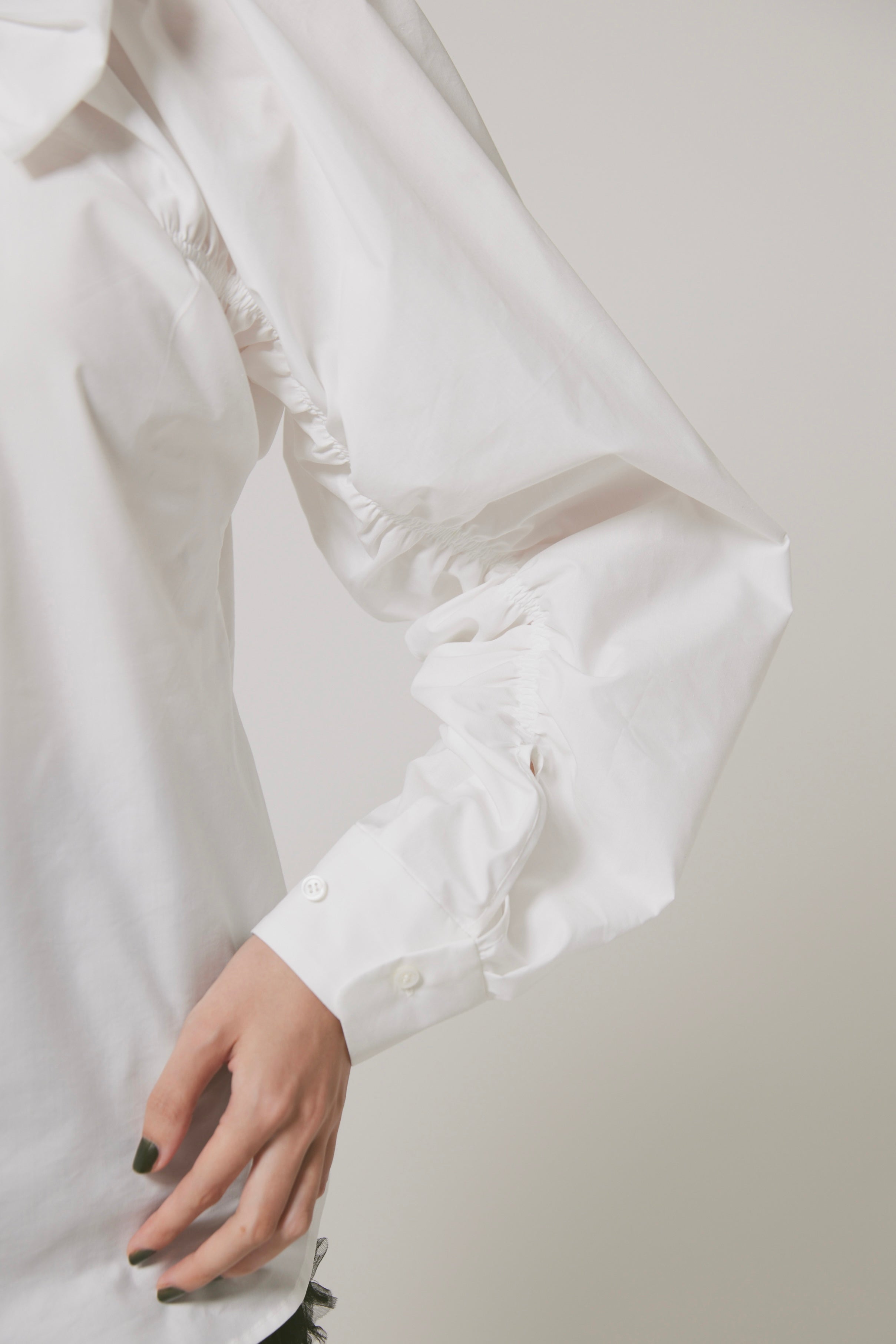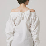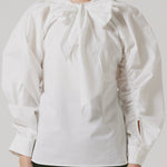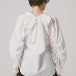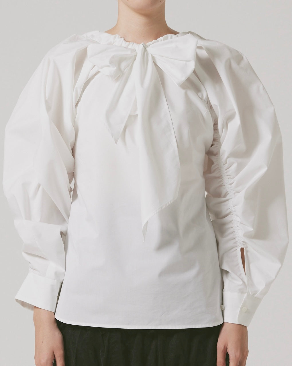強くて甘い、クラシカルな一枚。ボリュームのあるお袖のギャザーや大きなリボンなど、甘いディテールがつまっているのに、端正で強さを感じさせるデザインに仕上げました。