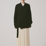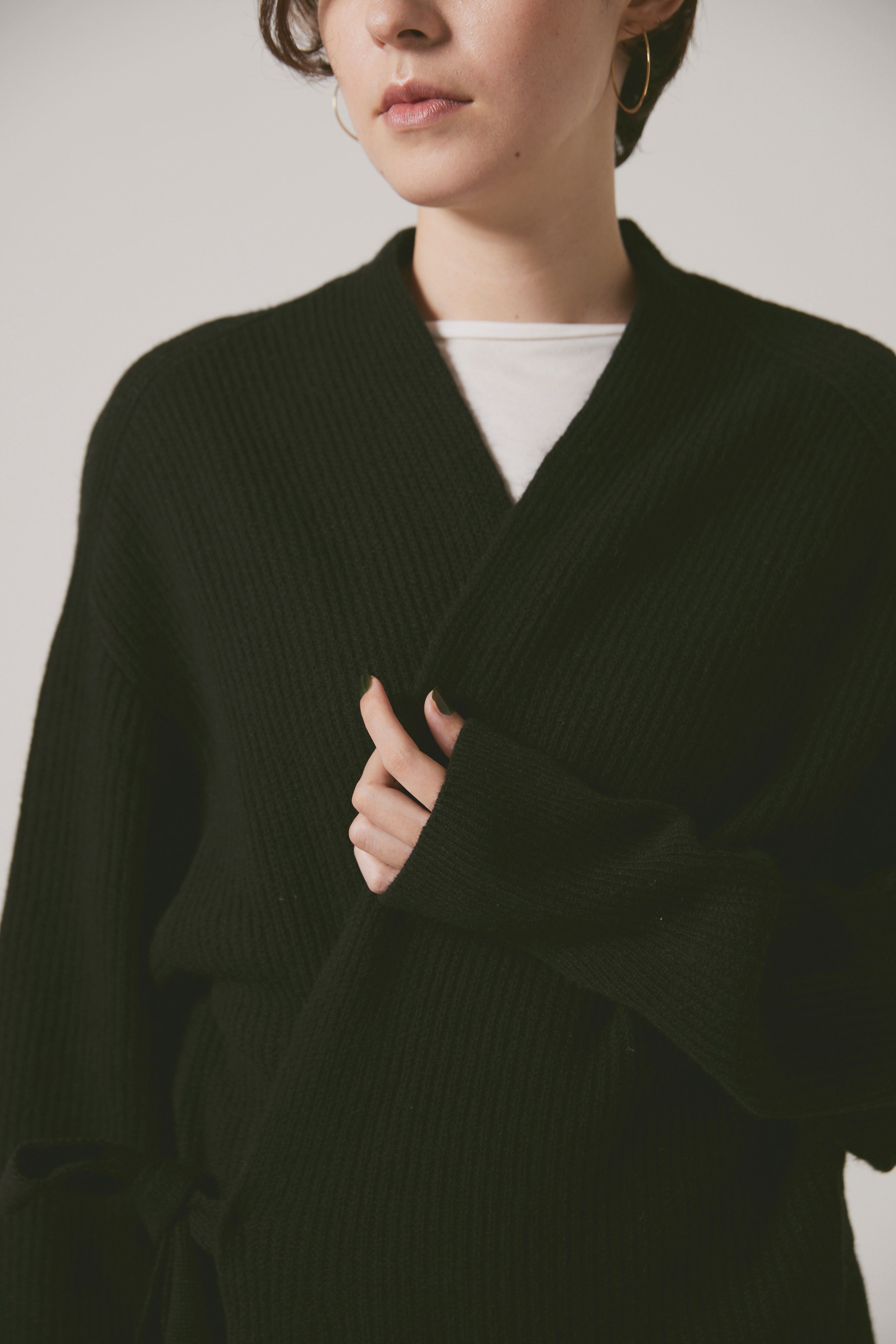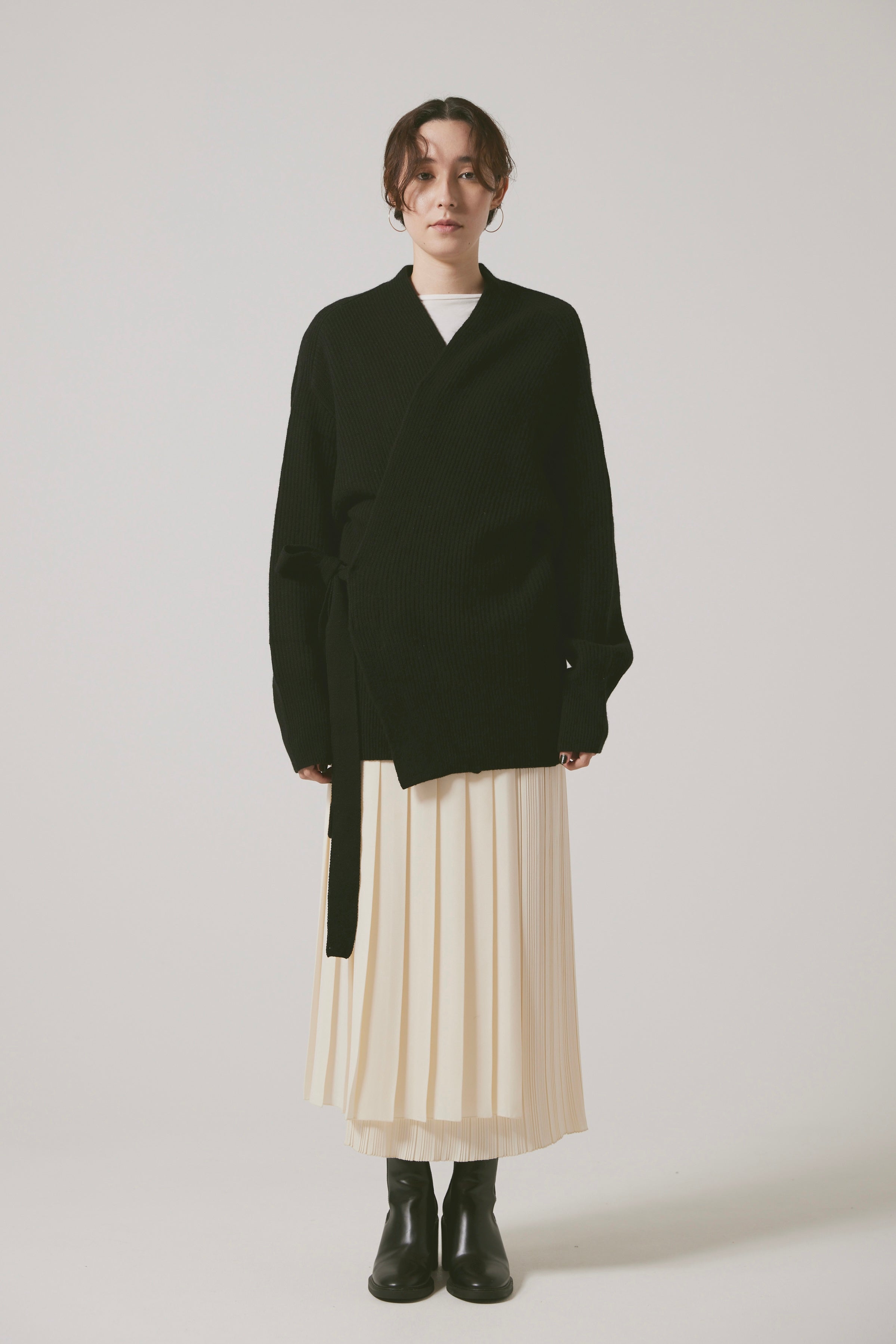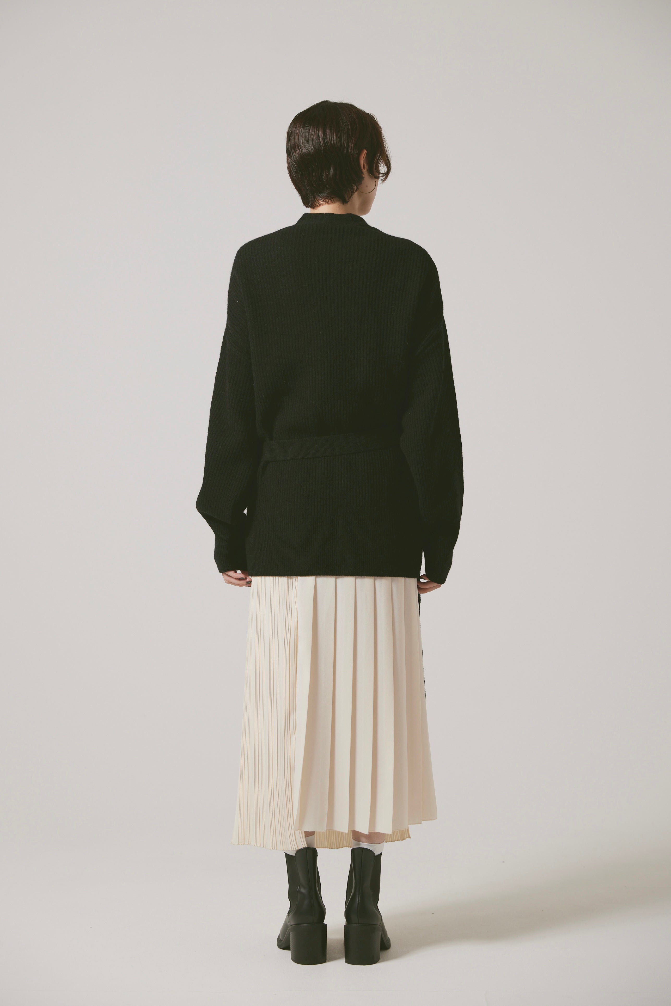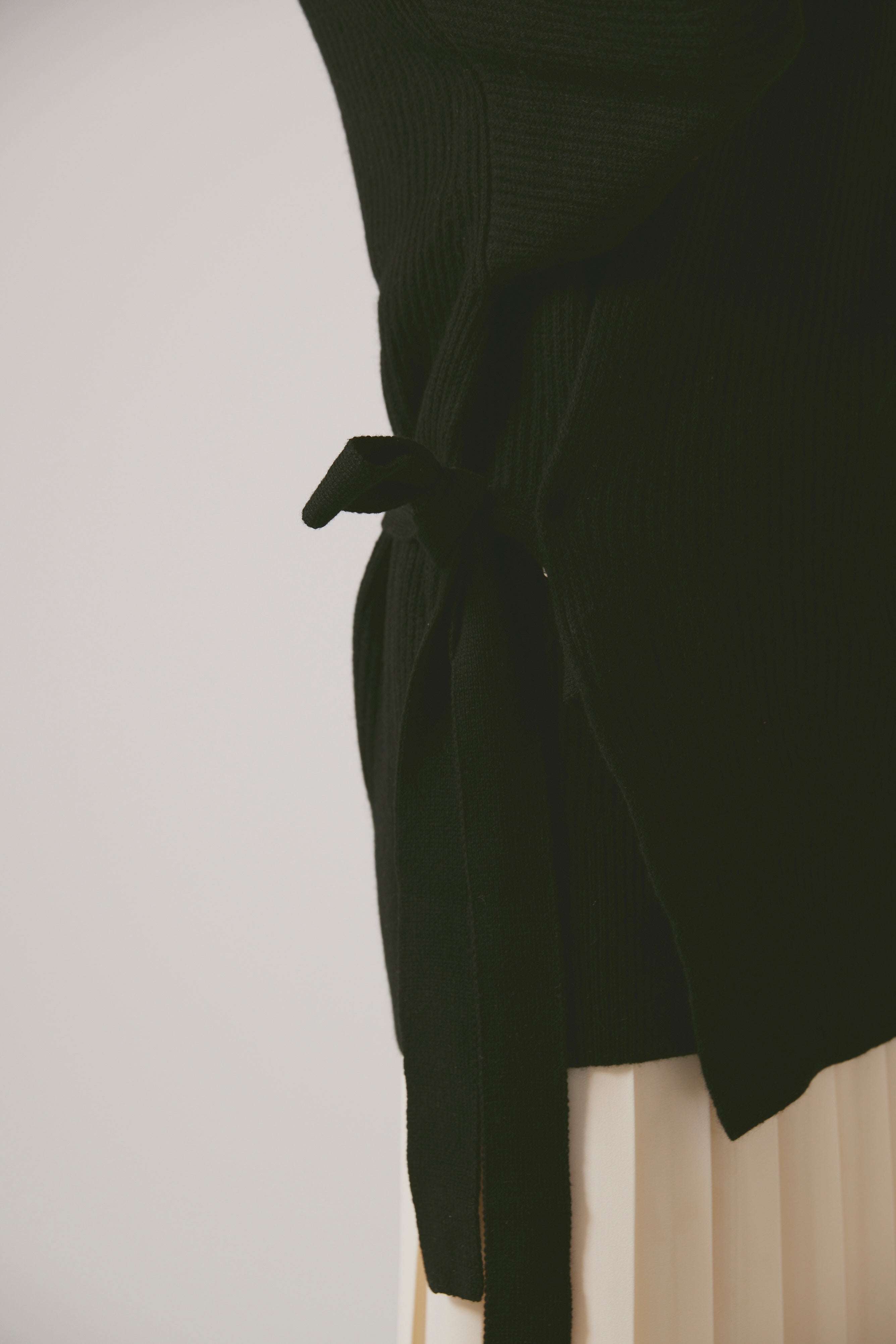 「反毛」と言われる、糸の裁断クズや糸くず、古着などを反毛機・割糸機などで処理しアップサイクルして作られた素材を使用。裁断クズは年間約12万トンが排出されていると言われており、本来ならば廃棄される予定だった裁断くずを有効活用した、循環型のニット。ベルトの通し方で幾通りにもアレンジ可能です。