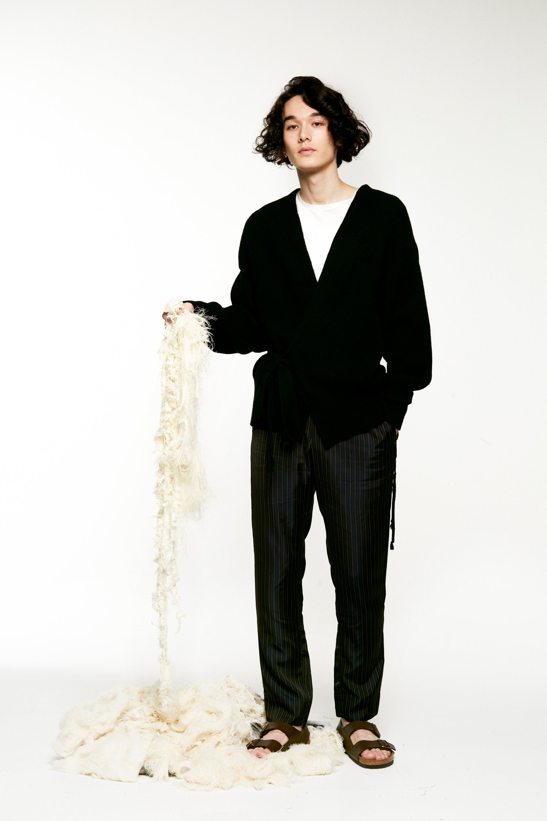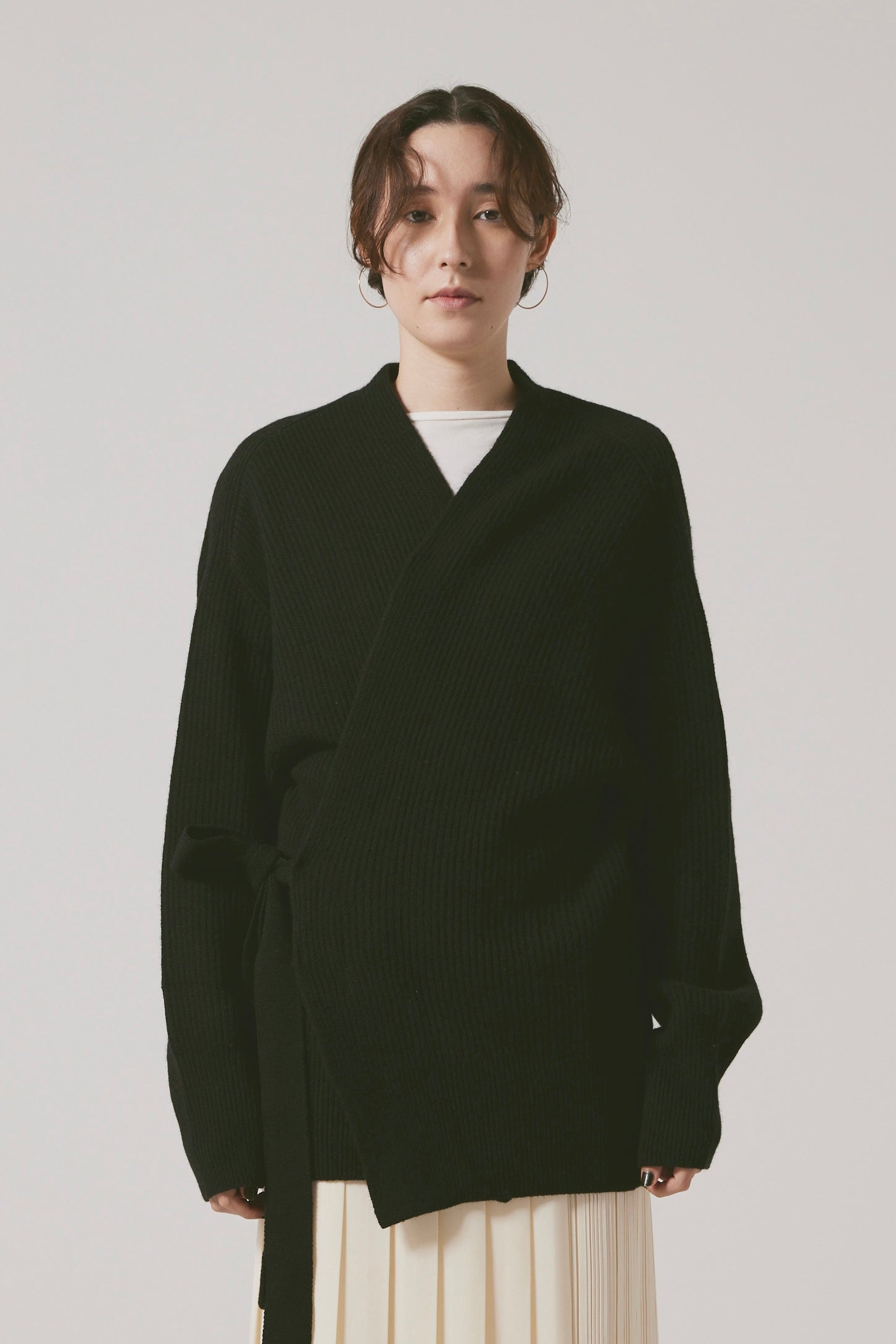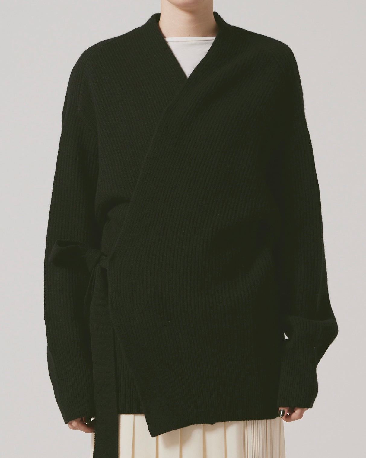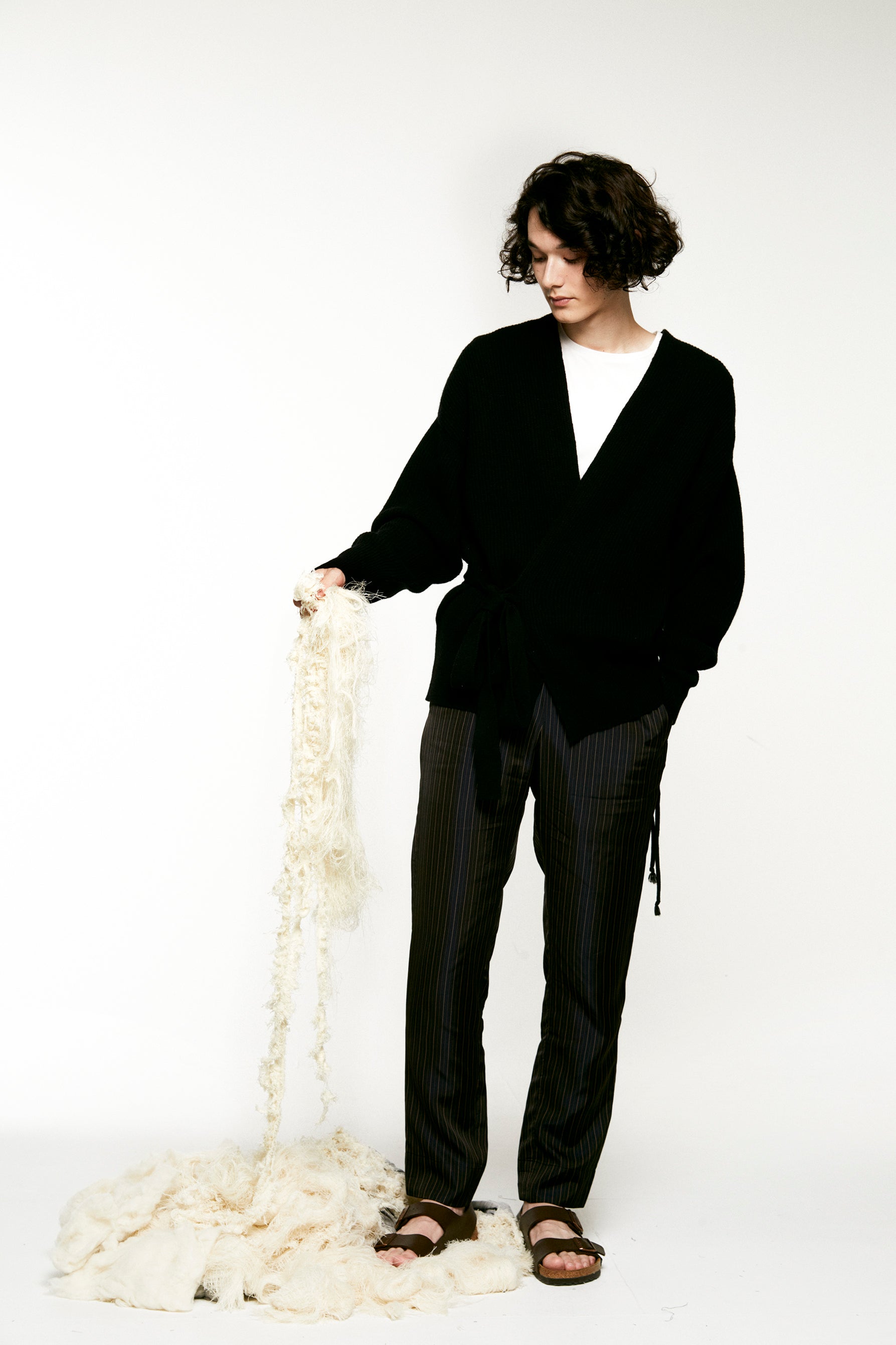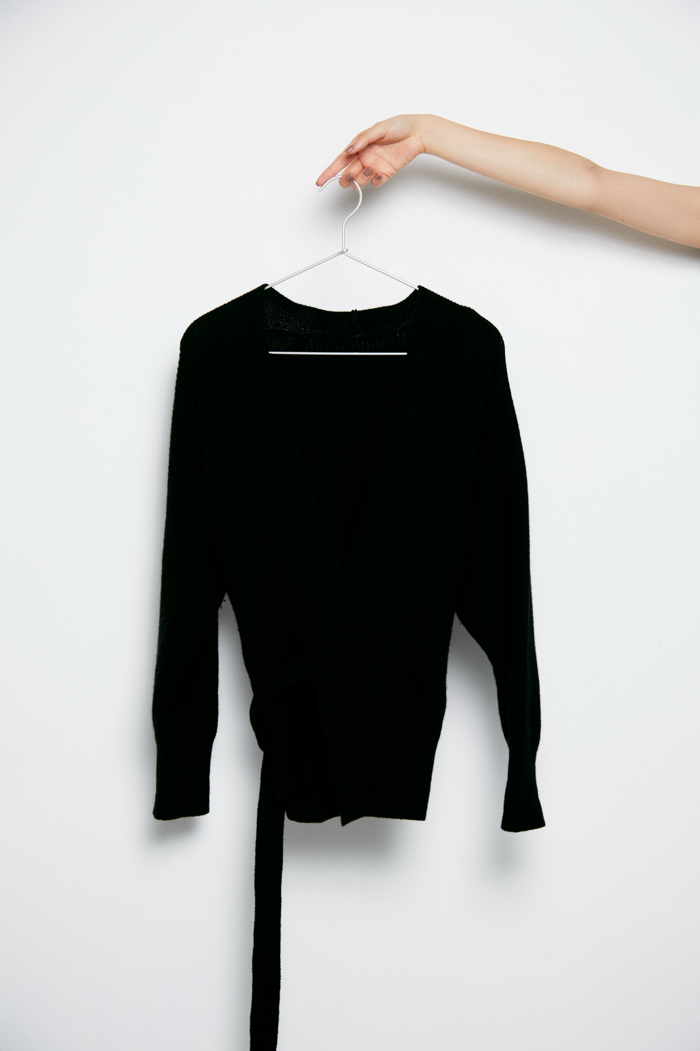 「反毛」と言われる、糸の裁断クズや糸くず、古着などを反毛機・割糸機などで処理しアップサイクルして作られた素材を使用。裁断クズは年間約12万トンが排出されていると言われており、本来ならば廃棄される予定だった裁断くずを有効活用した、循環型のニット。ベルトの通し方で幾通りにもアレンジ可能です。