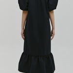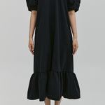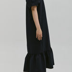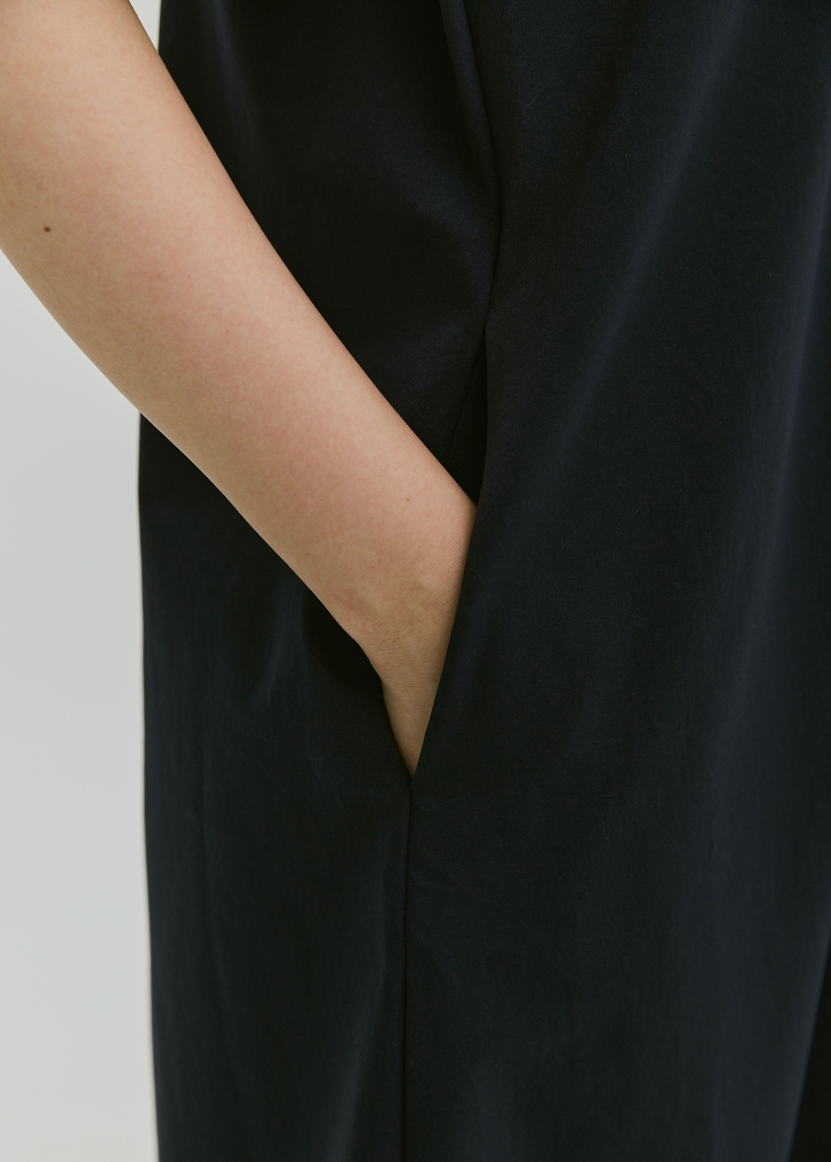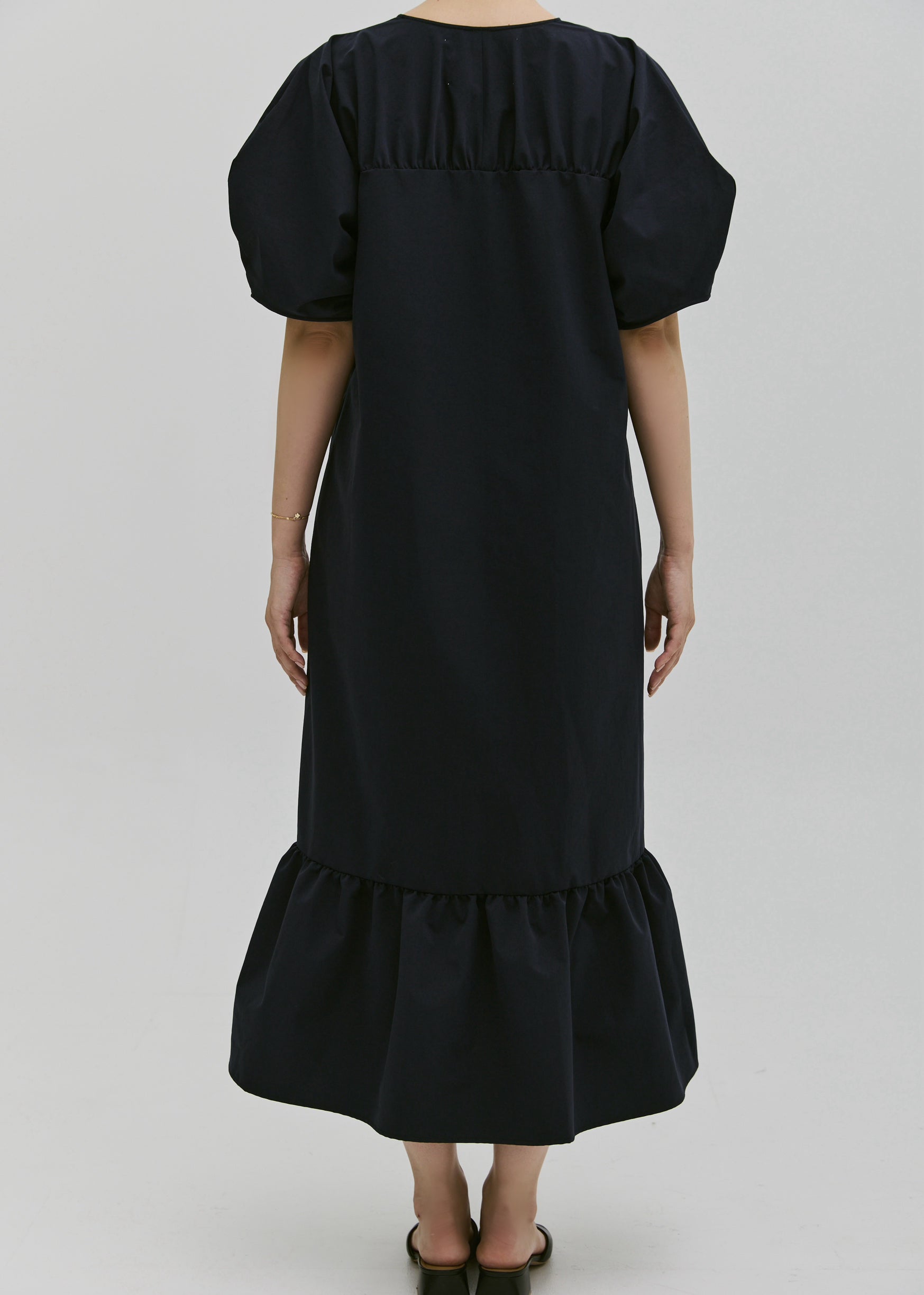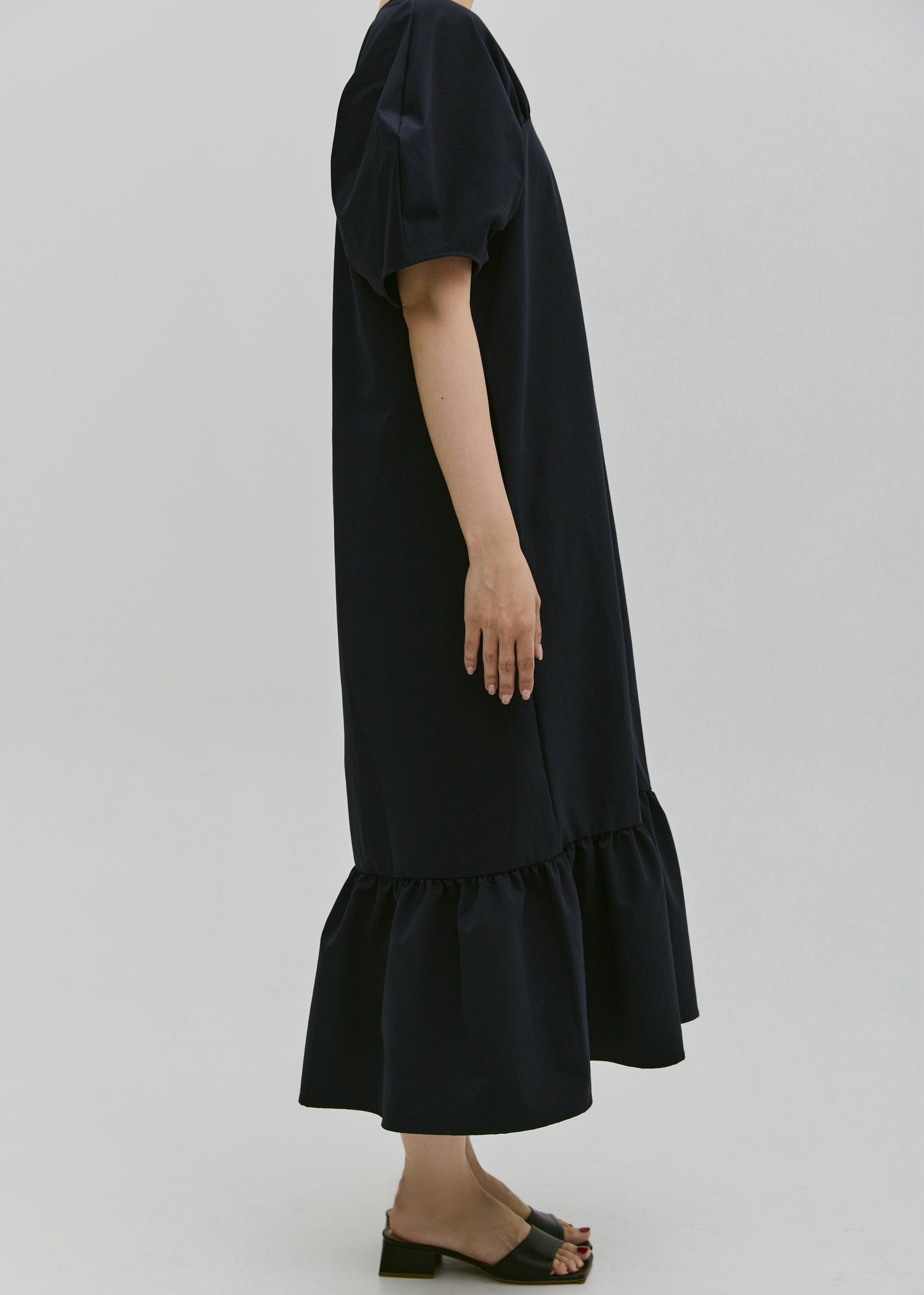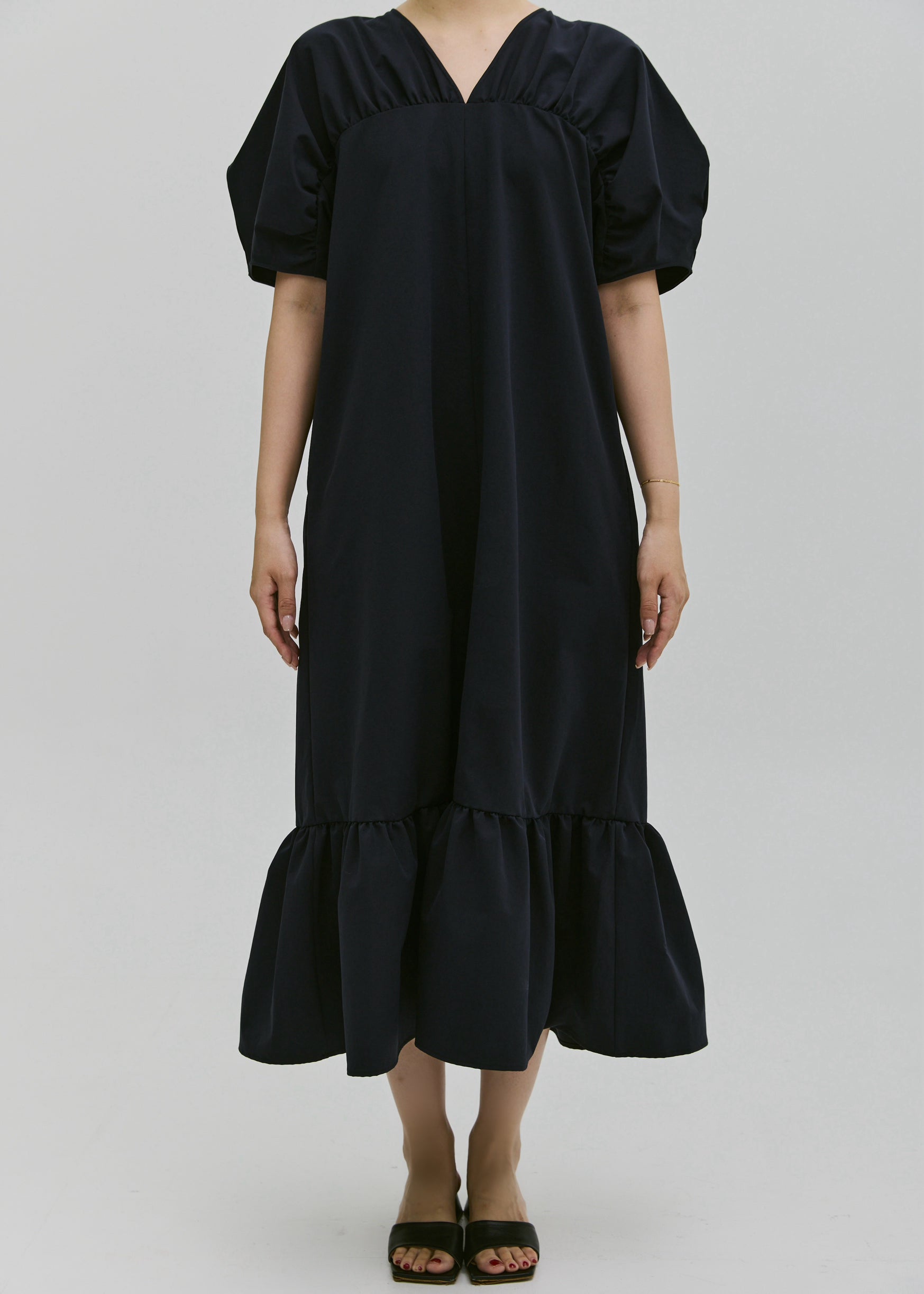 裾もギャザーでボリュームがありますが、すっきりした素材のお陰で甘さとヘルシーさの絶妙なバランスがポイント。着用感もサラッと快適で、ポケット付きなので日常使いもしやすいです。黒に近いネイビーなので、黒派の方にもおすすめ。
