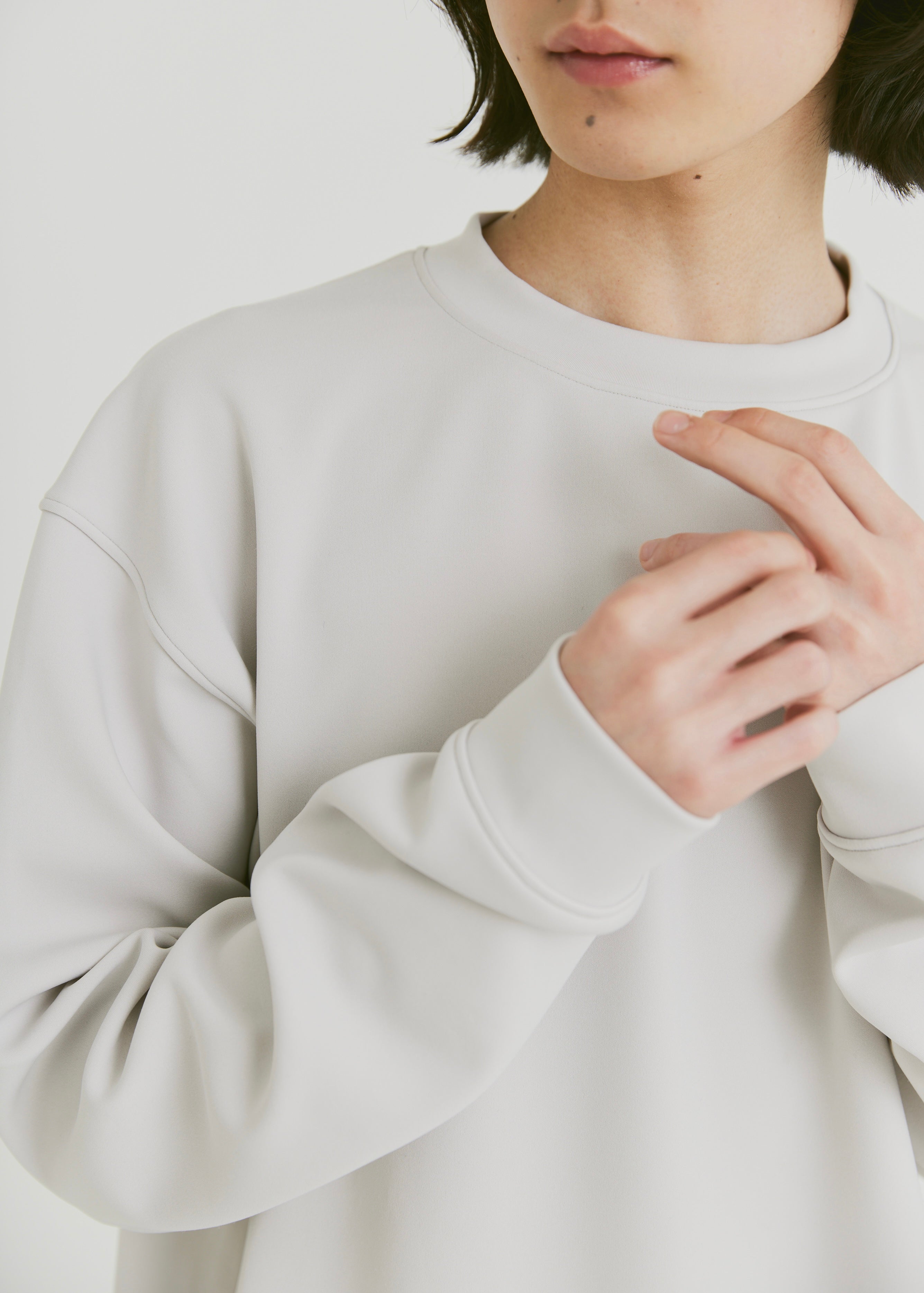 全体のシルエットや袖の太さは、リラックス感は保ちつつも太すぎずに上品な印象に。また首元の開き具合やカーブは、スッキリと仕上げました。