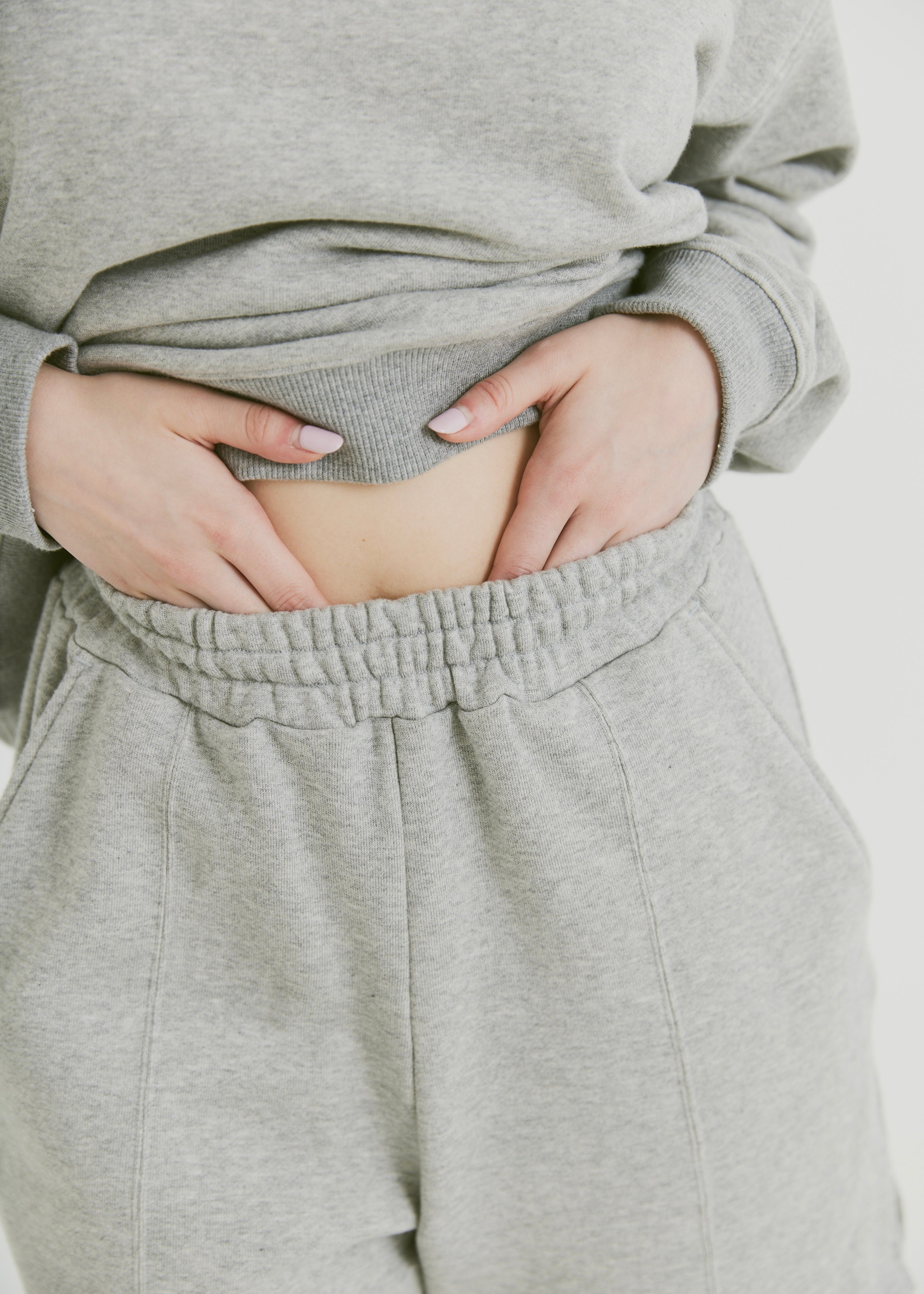 程よい丈感とセンタープレス風の切替で、大人っぽい印象に。