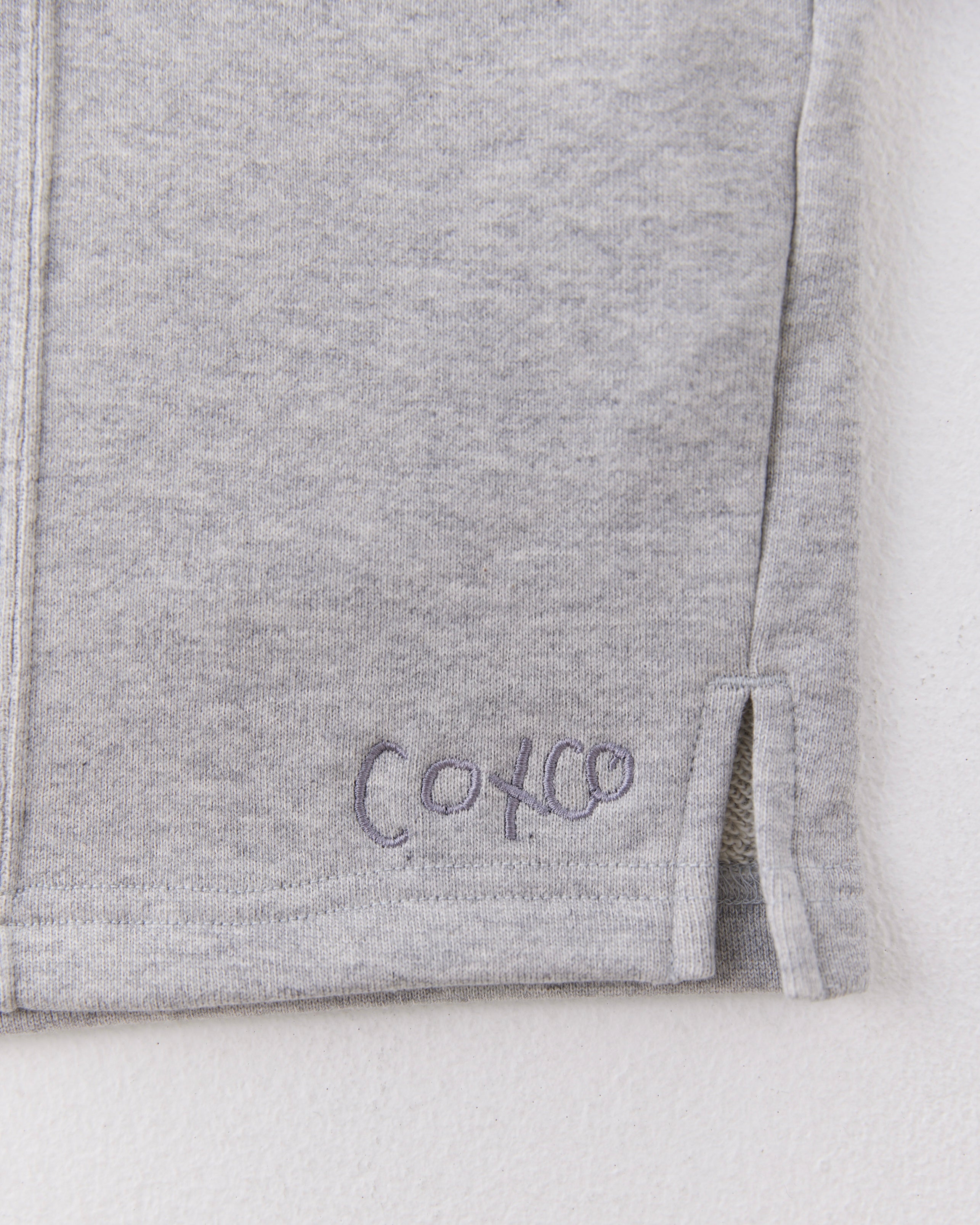 オーガニックコットン100%の柔らかい生地で製作した、大人が綺麗に履けるスウェットショートパンツ。左下に生地と同色の「coxco」刺繍、ヒップのタグがポイントのアイテムです。刺繍とタグの文字は、連携NPO団体「DEAR ME」でサポートしているフィリピンの女の子によって描かれています。