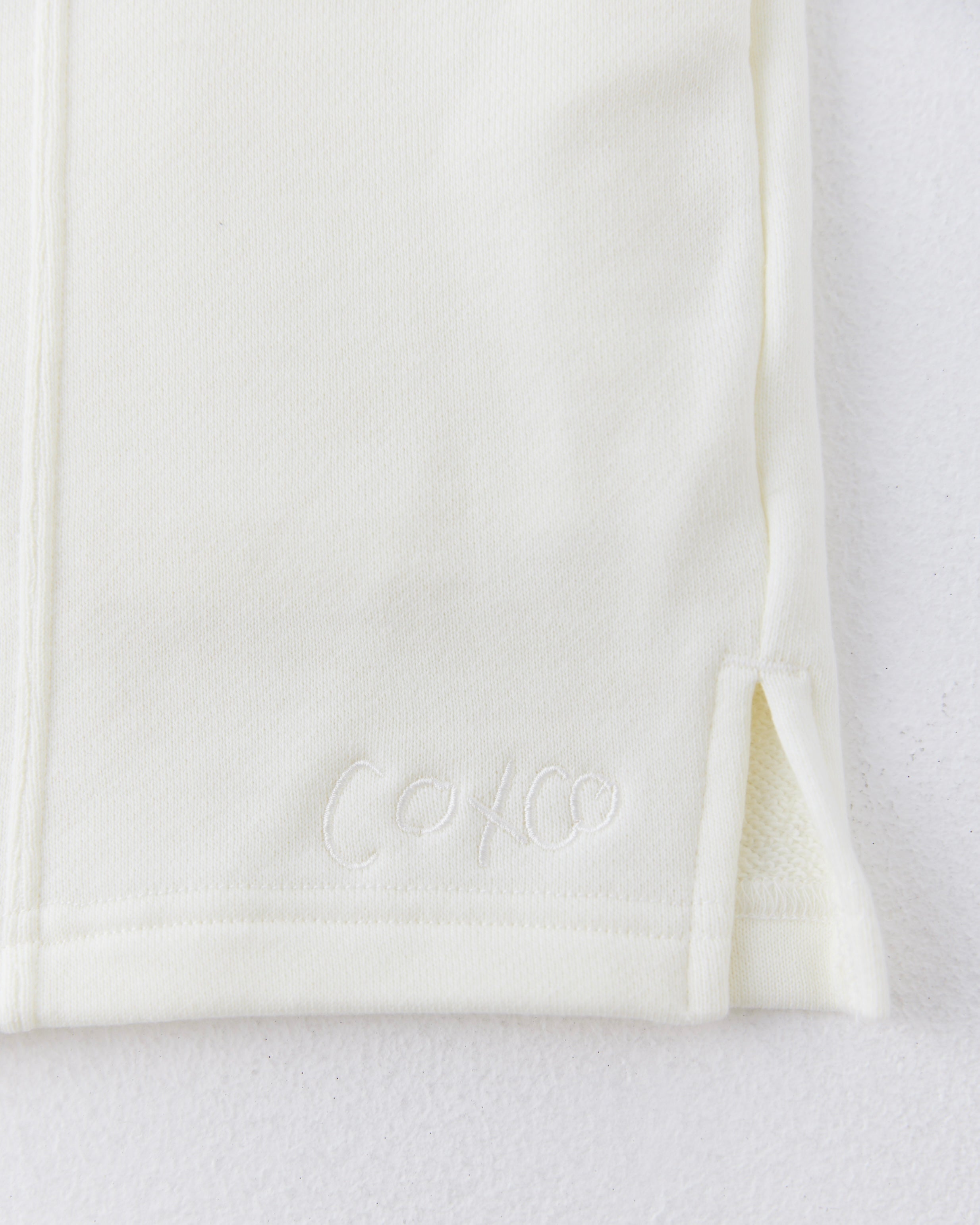 オーガニックコットン100%の柔らかい生地で製作した、大人が綺麗に履けるスウェットショートパンツ。左下に生地と同色の「coxco」刺繍、ヒップのタグがポイントのアイテムです。刺繍とタグの文字は、連携NPO団体「DEAR ME」でサポートしているフィリピンの女の子によって描かれています。
