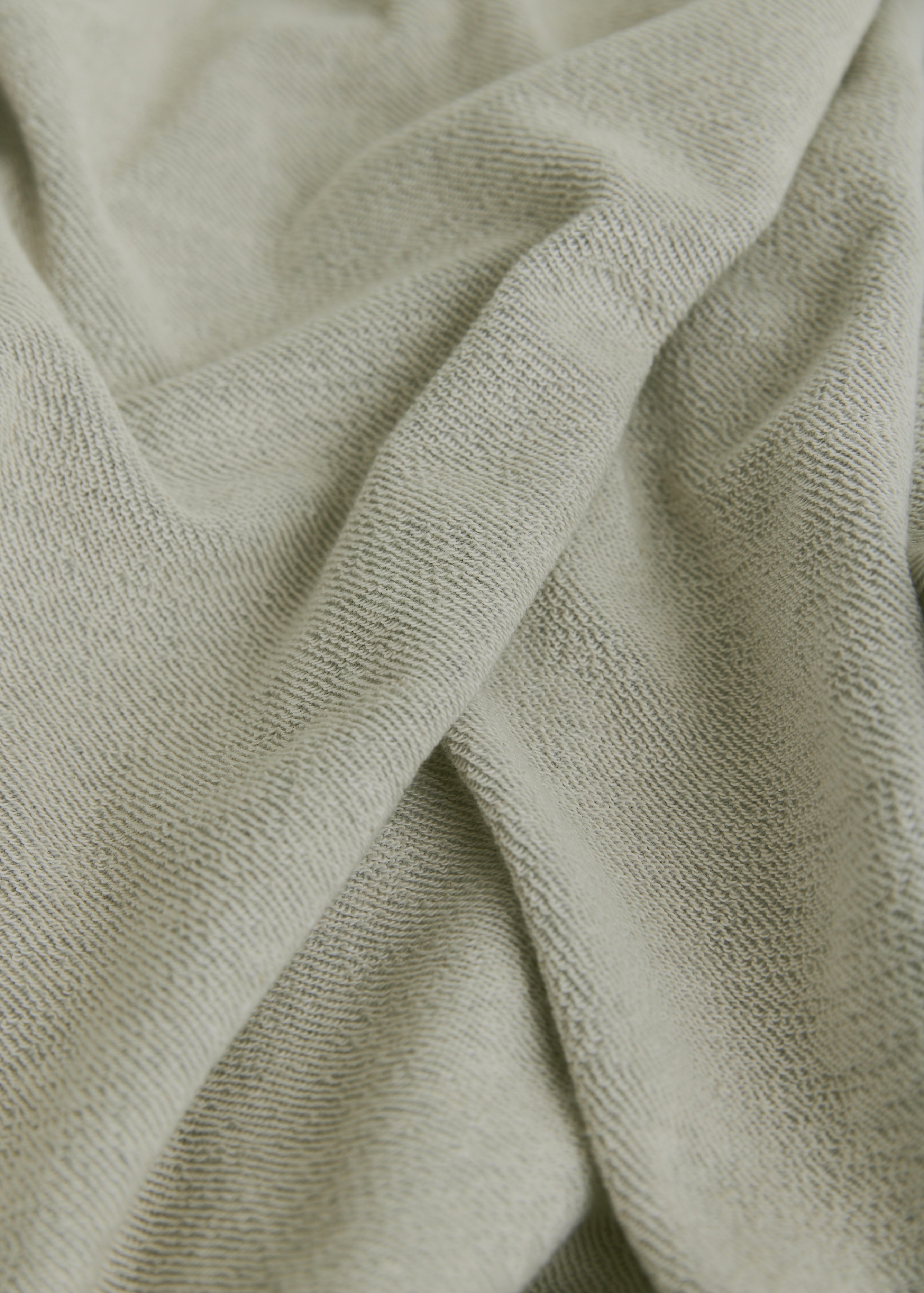 The overall silhouette and the width of the sleeves are relaxed yet not too wide, giving an elegant impression. The opening and curve of the neck are neatly finished.
