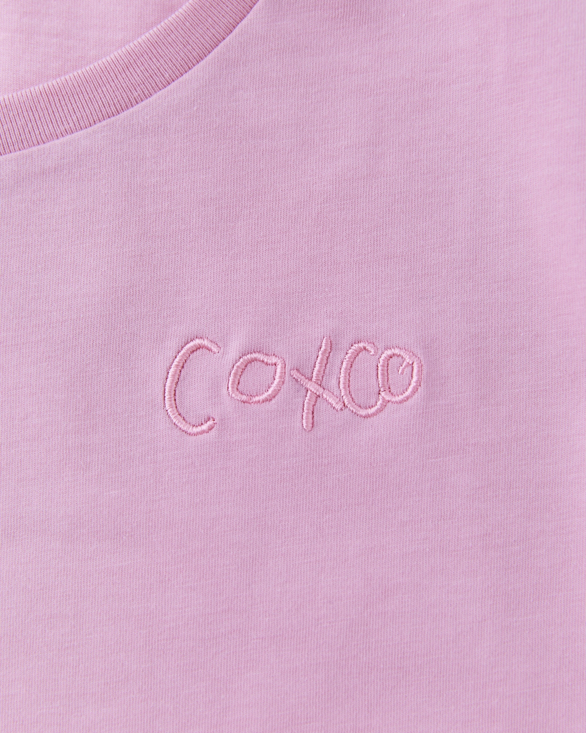 This T-shirt is made of 100% organic cotton. The key features of this item are the "coxco" embroidery on the left chest in the same color as the fabric, and the tag on the back. The embroidery and the tag were drawn by a girl from the Philippines who is supported by the affiliated NPO "DEAR ME."