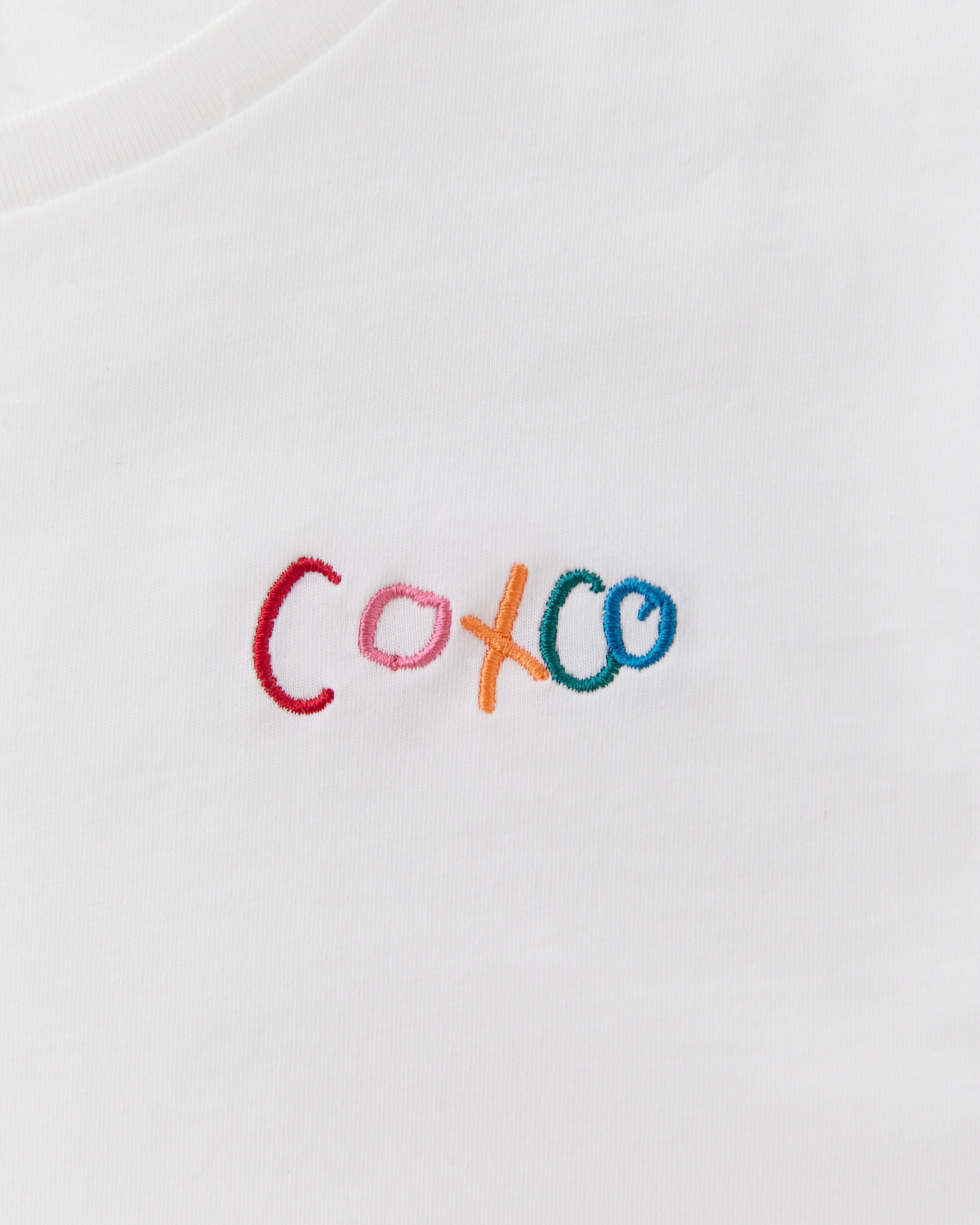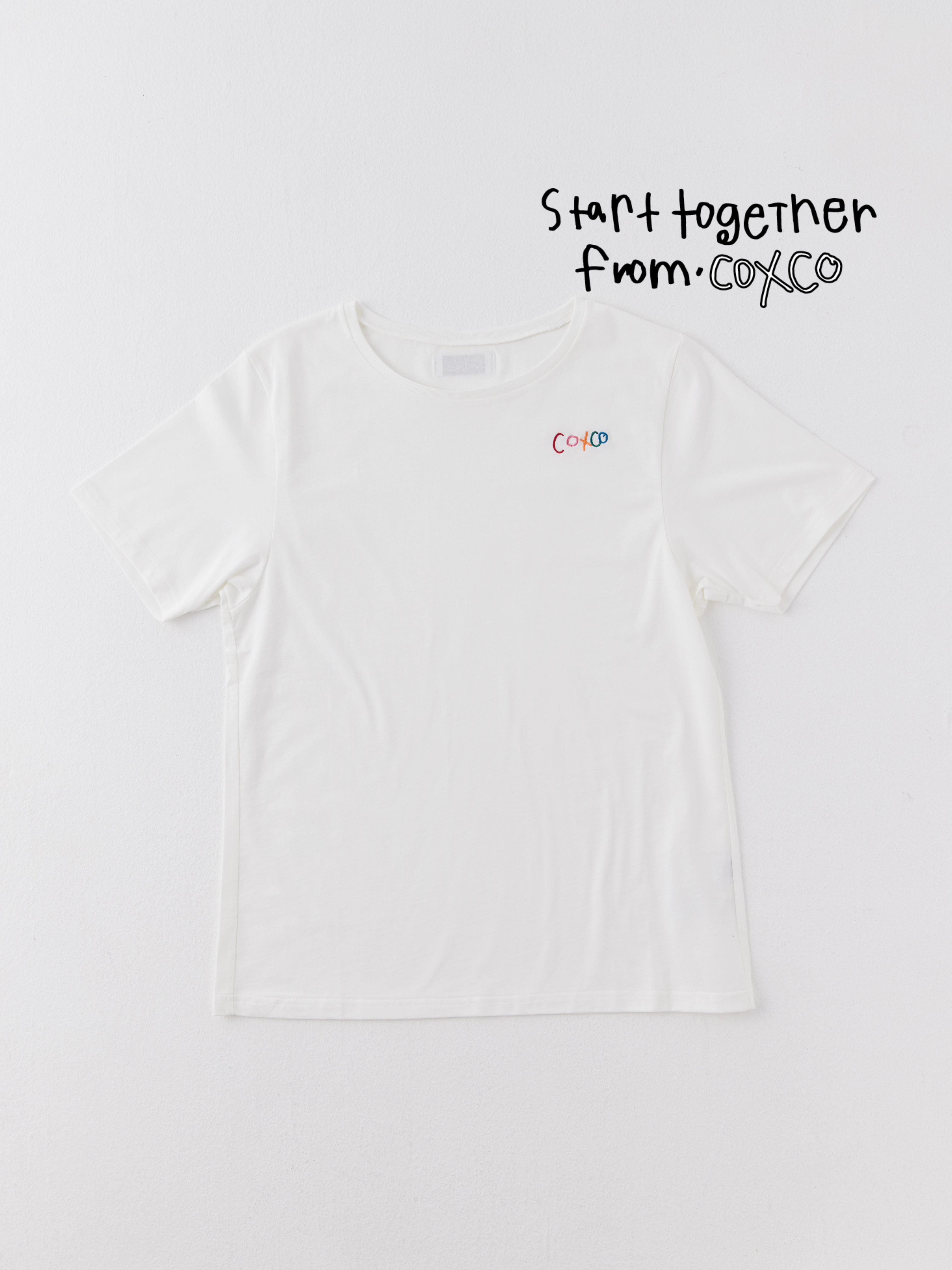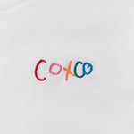 This T-shirt is made of 100% organic cotton. The key features of this item are the "coxco" embroidery on the left chest and the tag on the back. The embroidery and the tag were drawn by a girl from the Philippines who is supported by the affiliated NPO "DEAR ME."
